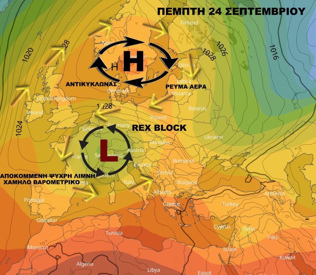Συνεχίζει να παρατηρείται το φαινόμενο REX BLOCK με τον Αντικυκλώνα να βρίσκεται σε βόρεια γεωγραφικά πλάτη της Ευρώπης σε Σκανδιναβικές χώρες με την αποκομμένη ψυχρή λίμνη σε ανώτερη ατμόσφαιρα και χαμηλό βαρομετρικό νότια του Αντικυκλώνα περιοχή Γαλλίας-Ιταλίας. Το χαμηλό βαρομετρικό συνοδεύεται με μέτωπα κακοκαιρίας με αποτέλεσμα άστατος καιρός με βροχές, καταιγίδες και χαμηλές θερμοκρασίες.
