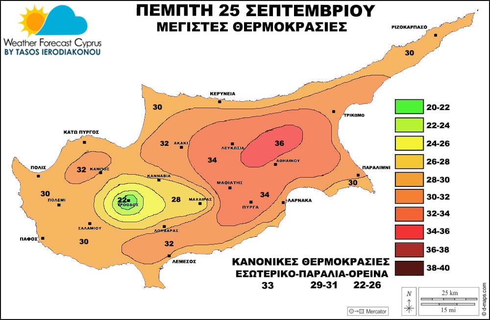 Παρασκευή, Σάββατο και Κυριακή 26-28 Σεπτεμβρίου με ηλιοφάνεια και κάποιες περιόδους με τοπικές νεφώσεις με την θερμοκρασία χωρίς ιδιαίτερη μεταβολή μέχρι το Σάββατο και θα είναι οι μέγιστες στο εσωτερικό στους 34-36 βαθμούς, στα παράλια μεταξύ 29-32 βαθμούς και στα ημιορεινά μεταξύ 29-35 βαθμούς. Στα ορεινά μεταξύ 22-28 βαθμούς. Την Κυριακή φαίνεται μια μικρή πτώση της θερμοκρασίας 1-2 βαθμούς που θα είναι περαιτέρω επόμενη εβδομάδα για να έχουμε θερμοκρασίες κανονικές έως λίγο κάτω της κανονικής. Πιθανές μέγιστες μέχρι Τρίτη 30 Σεπτεμβρίου εσωτερικό μεταξύ 29-31 βαθμούς, παράλια μεταξύ 28-30 βαθμούς και στα ορεινά μεταξύ 20-26 βαθμούς.