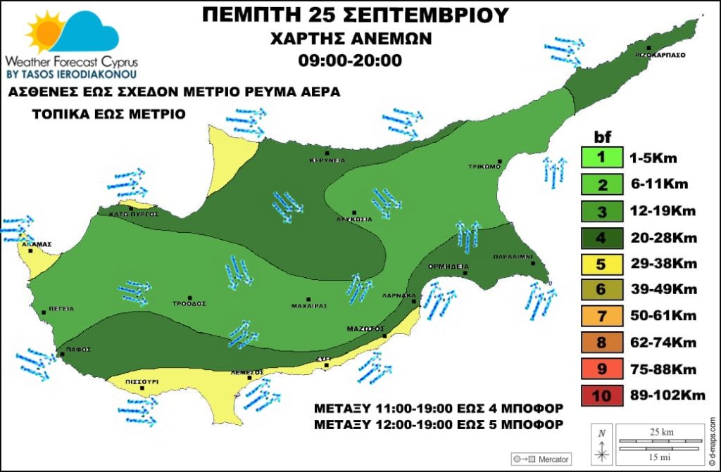 Ενισχύεται το πεδίο ανέμων. Ασθενές έως σχεδόν μέτριο ρεύμα αέρα 3 έως 4 μποφόρ και τοπικά έως μέτριο ρεύμα αέρα στα 5 μποφόρ μεταξύ των ωρών 09:00-20:00. Έως 4 μποφόρ μεταξύ των ωρών 11:00-19:00. Έως 5 μποφόρ μεταξύ των ωρών 12:00-19:00. Δυτικό-Βορειοδυτικό ρεύμα αέρα που στα νότια-νοτιοανατολικά γυρίζει σε Νοτιοδυτικό ρεύμα αέρα. Βραδινές ώρες Δυτικό-Βορειοδυτικό ρεύμα αέρα εντάσεως 2 έως 3 μποφόρ.