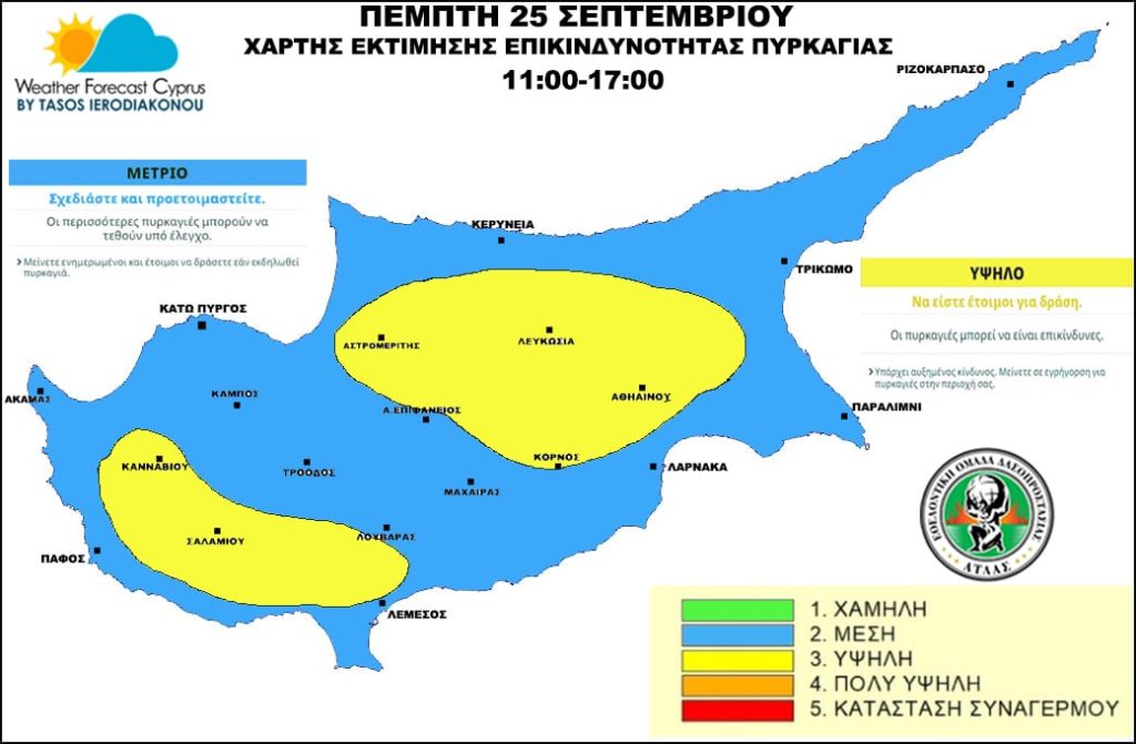 Μέτρια η επικινδυνότητα εξάπλωσης πυρκαγιάς έως υψηλή πιο τοπικά λόγω των υψηλών θερμοκρασιών, των χαμηλών ποσοστών υγρασίας αλλά και του ενισχυμένου πεδίου ανέμων.