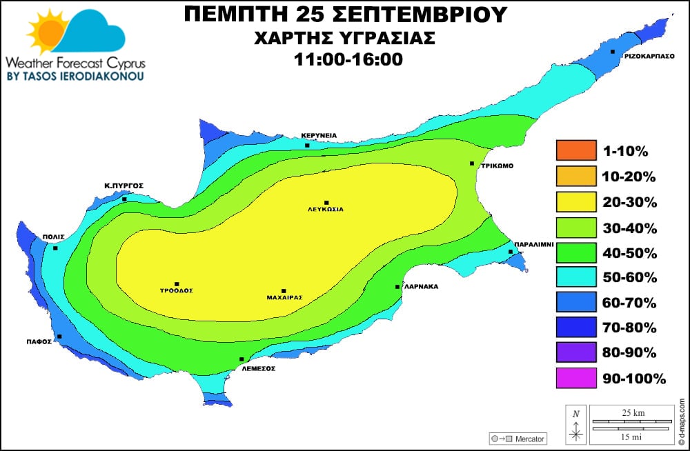 Ανεβαίνουν λίγο τα ποσοστά υγρασίας αλλά παραμένουν χαμηλά σε αρκετές περιοχές του νησιού κατά την διάρκεια της ημέρας θα είναι μεταξύ 25-40% ενώ στα παράλια μεταξύ 45-70%. Λίγο πιο πάνω τα ποσοστά αργά το βράδυ στο 65-80% εκτός από ορεινά που θα είναι στο 35-50%.