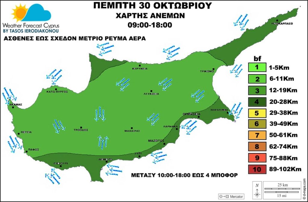 Εξασθενημένο το πεδίο ανέμων. Ασθενές έως σχεδόν μέτριο ρεύμα αέρα 3 έως 4 μποφόρ μεταξύ των ωρών 09:00-18:00. Έως 4 μποφόρ μεταξύ των ωρών 10:00-18:00.