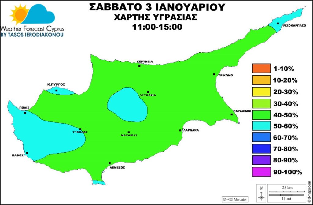 Ποσοστά υγρασίας μεσημβρινές ώρες σε εσωτερικό μεταξύ 40-55% και ορεινά μεταξύ 40-60%. Παράλια μεταξύ 40-60%. Βράδυ Σαββάτου προς Κυριακή ξημερώματα μεταξύ 70-85%.