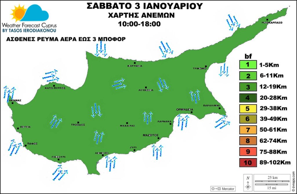 Εξασθενημένο πεδίο ανέμων. Ασθενές ρεύμα αέρα έως 3 μποφόρ μεταξύ των ωρών 10:00-18:00. Βόρειο-Βορειοδυτικό έως Νότιο-Νοτιοδυτικό ρεύμα αέρα. Βραδινές ώρες διαφόρων διευθύνσεων έως 2 μποφόρ και στα παραθαλάσσια έως 3 μποφόρ.