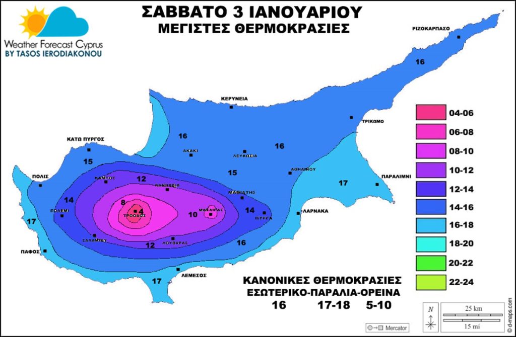 Μέγιστες θερμοκρασίες σε μικρή άνοδο και θα είμαστε κοντά στις κανονικές θερμοκρασιακές τιμές με μέγιστες στο εσωτερικό στους 15-16 βαθμούς, παράκτια-παράλια τμήματα στους 16-17 βαθμούς και στα ορεινά μεταξύ 4-10 βαθμούς (από τα 1000 μέτρα και πάνω) και στους 2 βαθμούς πάνω στον Όλυμπο. Στα ημιορεινά μεταξύ 11-15 βαθμούς.