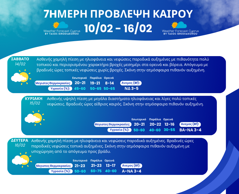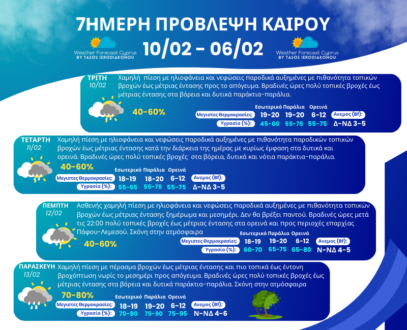 -Πεδίο χαμηλών πιέσεων θα επηρεάζει την περιοχή της Κύπρου τις επόμενες ημέρες για αυτό υπάρχουν πιθανότητες κατά περιόδους να δεχόμαστε βροχές από αύριο Τρίτη 10 Φεβρουαρίου. Βροχές ελαφριάς έως μέτριας έντασης και παροδικά και πιο τοπικά έως έντονη βροχόπτωση. Μια περίοδος 10-18 Φεβρουαρίου που στο σύνολο θα πάρουμε αξιόλογες ποσότητες βροχής που θα βοηθήσει και στην ροή νερού προς τα φράγματα. Προς απόγευμα βροχές αύριο Τρίτη που κατά περιόδους συνεχίζονται και την Τετάρτη. Την Πέμπτη που είναι η Τσικνοπέμπτη δεν θα έχει βροχές παντού αλλά τοπικά τα ξημερώματα και το μεσημέρι σε περιοχές επαρχίας Πάφου και ορεινά τμήματα. Αργά το βράδυ μετά τις 22:00 τοπικά σε ορεινά και προς περιοχές επαρχίας Πάφου και Λεμεσού.