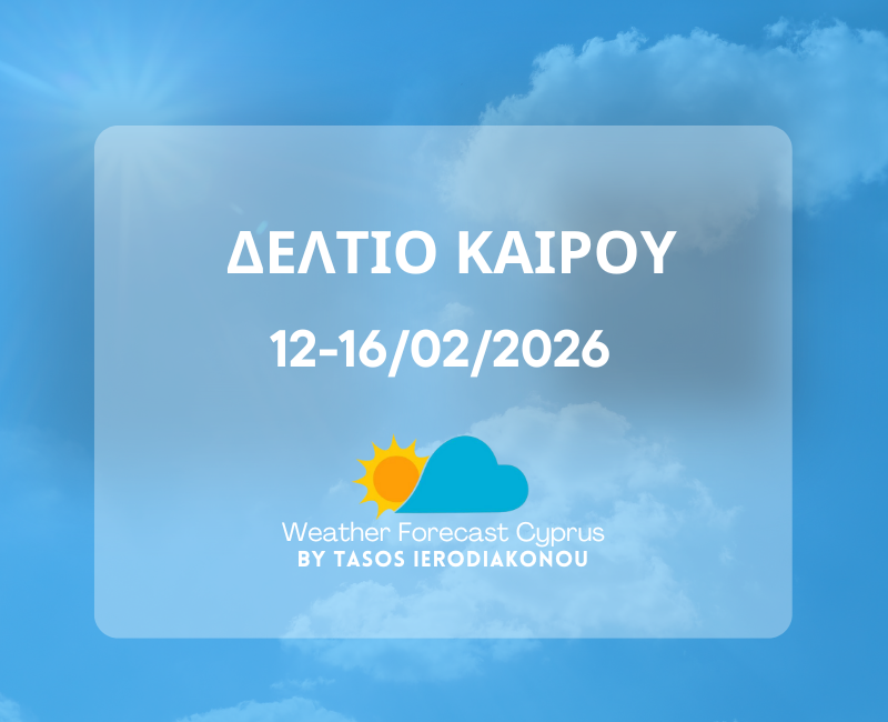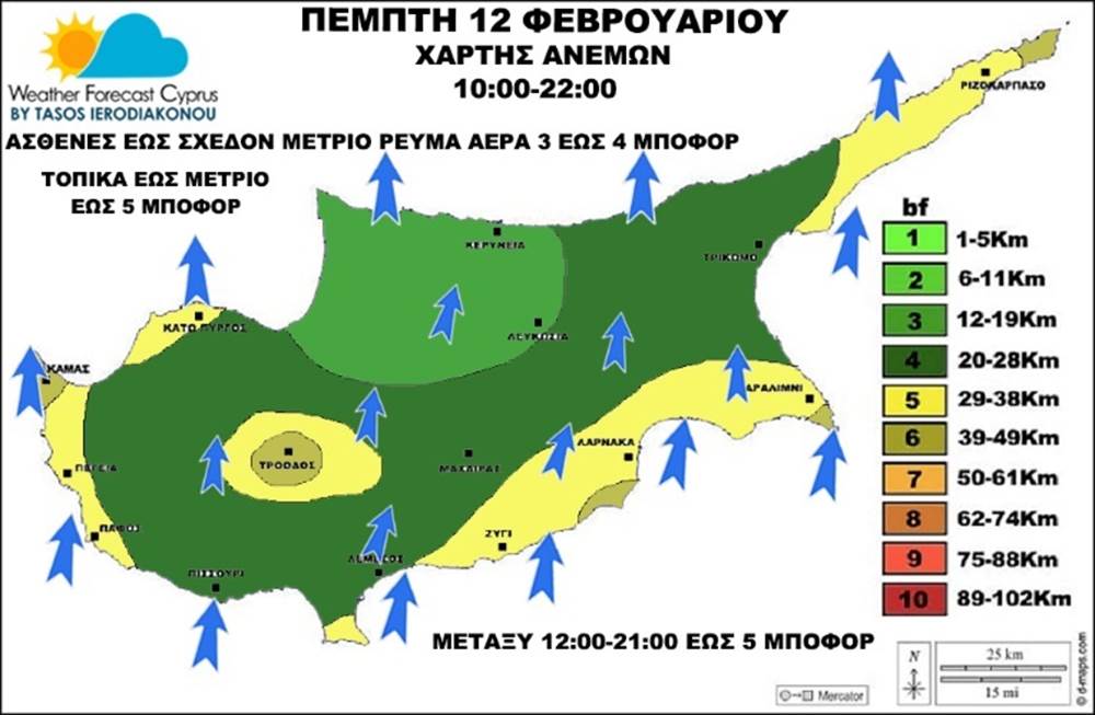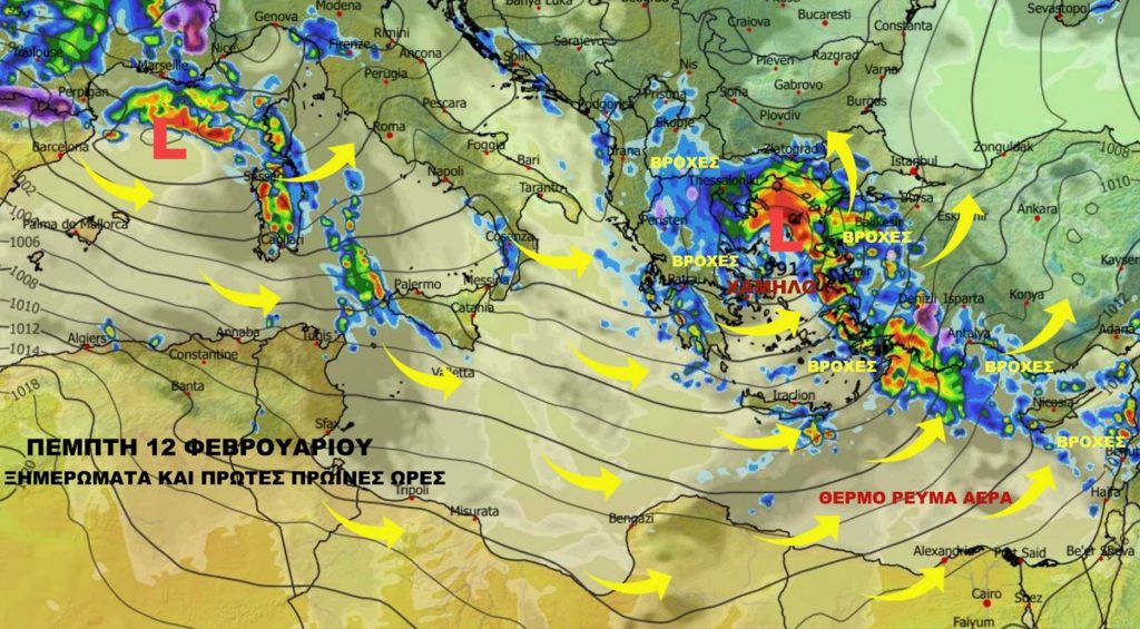 Πέμπτη 12 Φεβρουαρίου πεδίο χαμηλών πιέσεων επηρεάζει την ανατολική Μεσόγειο με το κέντρο του χαμηλού βαρομετρικού στο βόρειο Αιγαίο με το καιρικό σκηνικό στην Κύπρο τοπικά άστατο αλλά όχι συνεχόμενα και όχι παντού. Το θερμό ρεύμα αέρα προσεγγίζει μερικώς την περιοχή μας χωρίς όμως να μας επηρεάζει ιδιαίτερα με το ψυχρό ρεύμα αέρα να παραμένει πιο βόρεια από εμάς. Ο Αζορικός Αντικυκλώνας μεταφέρει θερμό ρεύμα αέρα προς Ισπανία.