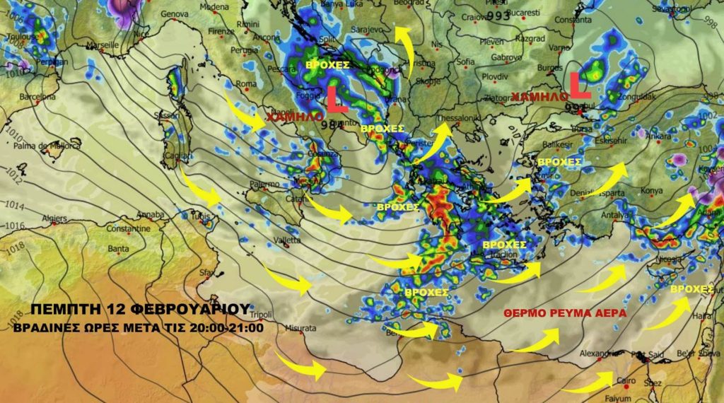 Βραδινές ώρες μετά τις 18:00 πολύ πιο τοπικού χαρακτήρα βροχές ελαφριάς έως μέτριας έντασης ορεινά-ημιορεινά με σταδιακή πρόσκαιρη εξασθένηση. Περισσότερες βροχές βρίσκονται στην Ελλάδα που σταδιακά θα κινηθούν ανατολικά προς την περιοχή μας για να μας επηρεάσουν σημαντικά την Παρασκευή 13 Φεβρουαρίου.
