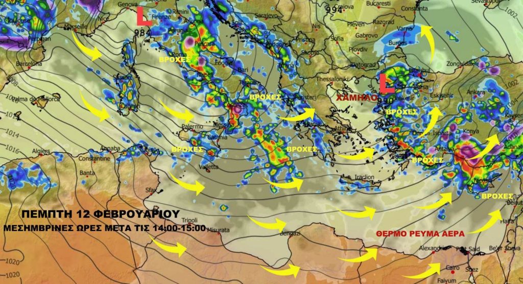 Ο Αζορικός Αντικυκλώνας ανυψώνεται μερικώς προς τα πάνω αναγκάζοντας σε Αυλώνα ψυχρού ρεύματος αέρα να κατηφορίσει προς Ισπανία και σε συνδυασμό με χαμηλά βαρομετρικά σε δυτική Ευρώπη και δυτική Μεσόγειο θα ανηφορίσει θερμό ρεύμα αέρα προς κεντρική Μεσόγειο αρχικά και ακολούθως προς την περιοχή μας για να επηρεαστούμε από Σάββατο μέχρι και Δευτέρα 14-16 Φεβρουαρίου.