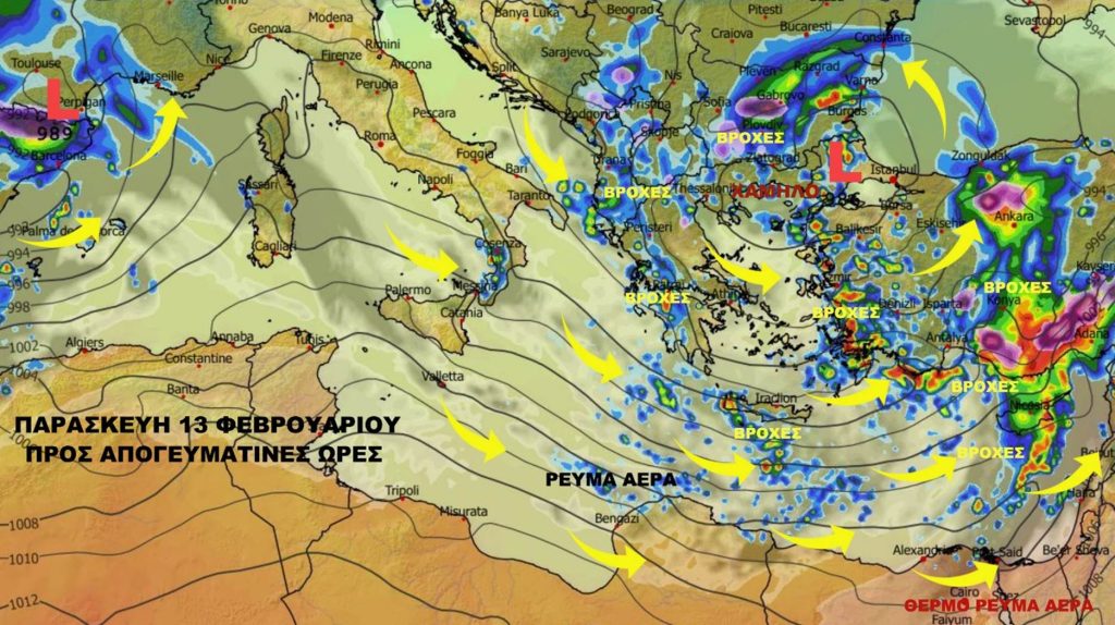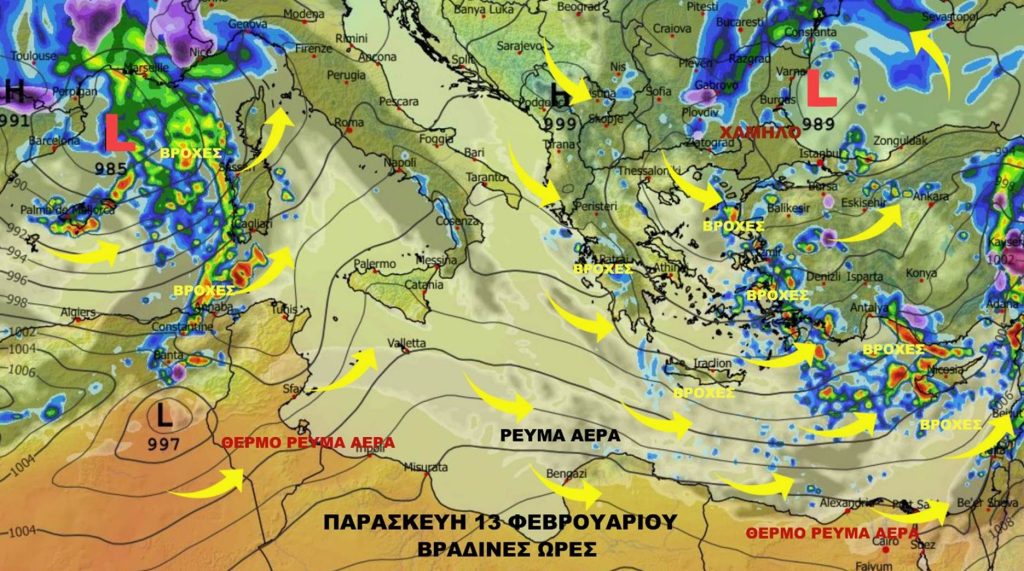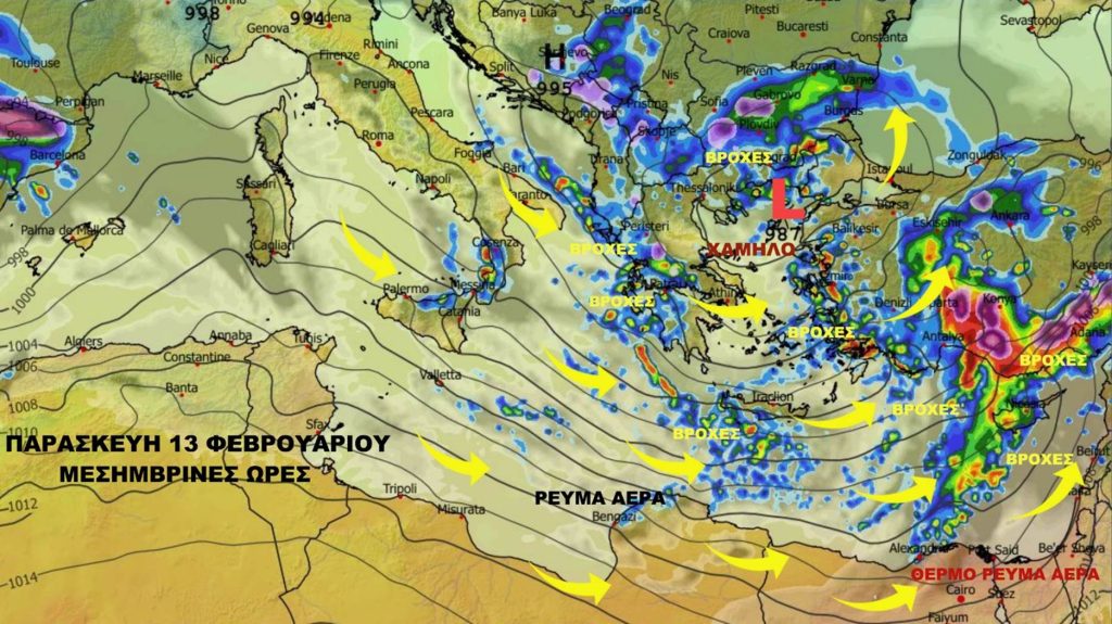Παρασκευή 13 Φεβρουαρίου παραμένουμε σε πεδίο χαμηλών πιέσεων με νέο χαμηλό βαρομετρικό στην περιοχή με το κέντρο του χαμηλού βαρομετρικού στην Ελλάδα που αυτό το χαμηλό βαρομετρικό δείχνει να μας επηρεάζει περισσότερο από τα προηγούμενα με περισσότερες βροχές αλλά και εκτεταμένες με ενδεχόμενο και αρκετές ποσοτικά. Οι βροχές κυρίως από το μεσημέρι και μετά.