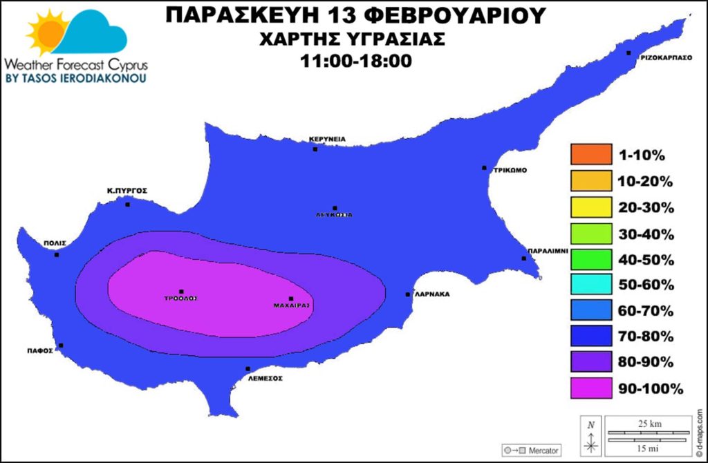 Με αυξημένα ποσοστά υγρασίας η Παρασκευή και θα είναι σε εσωτερικό και παράλια μεταξύ 70-80% ενώ πάνω στα ορεινά μεταξύ 80-100% Βράδυ Παρασκευής προς Σάββατο ξημερώματα αυξημένα ποσοστά υγρασίας μεταξύ 80-90% αλλά προς εσωτερικό και κυρίως ορεινά 90-100%.