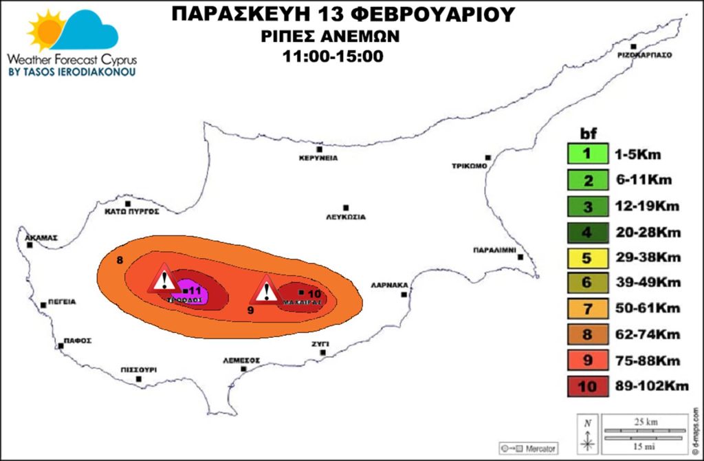 Μεσημβρινές ώρες περίπου μετά τις 14:00-15:00 ηλιοφάνεια, νεφώσεις παροδικά και τοπικά αυξημένες με σκόνη στην ατμόσφαιρα ενώ πολύ τοπικά στα δυτικά σε επαρχία Πάφου, ορεινά-ημιορεινά και βόρεια θα παρατηρηθούν κάποιες βροχές ελαφριάς έως μέτριας έντασης και σταδιακά ακόμα πιο τοπικά και σε άλλες περιοχές του νησιού με έμφαση κυρίως στο δυτικό-ορεινό και βόρειο τμήμα του νησιού αλλά σε γενικές γραμμές είναι για λίγες ώρες δηλαδή μικρό χρονικό διάστημα.