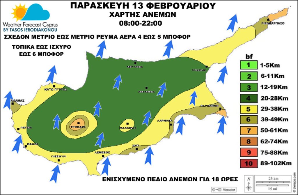 Σημαντικά ενισχυμένο το πεδίο ανέμων και θα είναι σχεδόν μέτριο έως μέτριο ρεύμα αέρα στα 4 έως 5 μποφόρ μεταξύ των ωρών 08:00-22:00 αλλά παροδικά και τοπικά ισχυρό έως σχεδόν θυελλώδης ρεύμα αέρα 6 έως 7 μποφόρ. Πολύ πιο τοπικά όμως έως 7 μποφόρ ψηλά ορεινά και στα ανατολικά-βορειοανατολικά. Νότιο-Νοτιοδυτικό ρεύμα αέρα. Αργά το βράδυ πέφτουν μερικώς τα μποφόρ αλλά σε γενικές γραμμές παραμένει ενισχυμένο Νότιο-Νοτιοδυτικό ρεύμα αέρα 3 έως 4 μποφόρ μποφόρ αλλά στα παράκτια-παράλια τμήματα παροδικά και έως 5 μποφόρ.