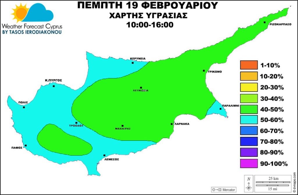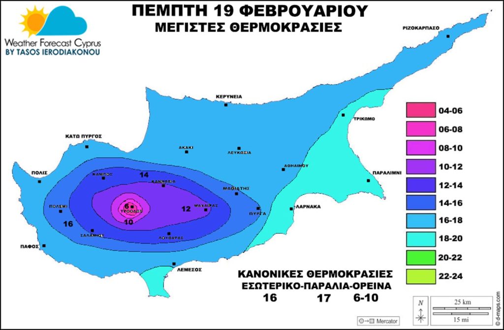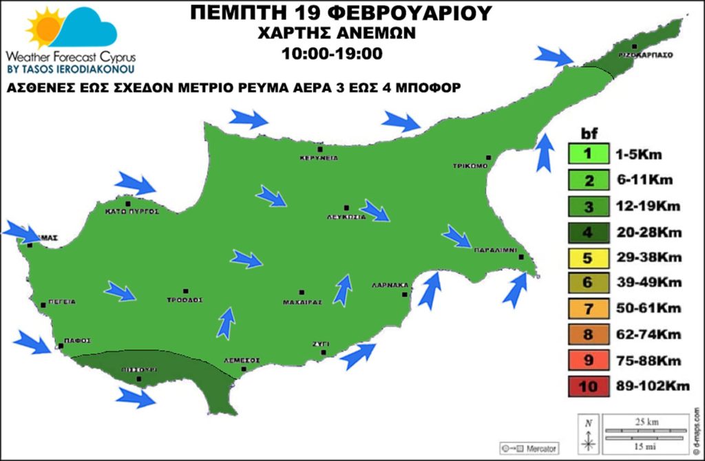 Πέμπτη 19 Φεβρουαρίου πεδίο υψηλών πιέσεων θα επηρεάζει την περιοχή μας με μεγάλα διαστήματα ηλιοφάνειας. Ξημερώματα προς πρωινές ώρες νεφώσεις στα δυτικά, νότια και ορεινά τμήματα. Μεσημέρι και απόγευμα ηλιοφάνεια με τις νεφώσεις να εντοπίζονται σε ανατολικές ορεινές-ημιορεινές περιοχές και ανατολικά-νοτιοανατολικά τμήματα σε περιοχές επαρχίας Λάρνακας και Αμμοχώστου. Βραδινές ώρες νεφώσεις στα ανατολικά-βορειοανατολικά παράκτια-παράλια τμήματα σε περιοχές επαρχίας Αμμοχώστου. Θερμό ρεύμα αέρα ανηφορίζει προς κεντρική Μεσόγειο χωρίς να μας επηρεάζει εμάς αύριο Πέμπτη.