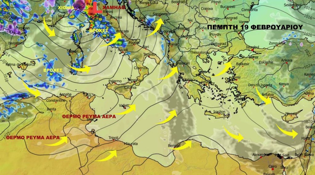 Παρασκευή 20 Φεβρουαρίου Αυλώνας ψυχρού ρεύματος αέρα εκτείνεται σε κεντρική Μεσόγειο με χαμηλό βαρομετρικό στην επιφάνεια περιοχή Ιταλίας και Ελλάδας. Αυτό ευνοεί σε άστατο καιρό σε περιοχές Ιταλίας και περισσότερο στην Ελλάδα. Εμείς στην Κύπρο δεχόμαστε ένα ανέβασμα θερμού ρεύματος αέρα με άνοδο θερμοκρασίας αλλά δεν δείχνει να είναι έντονο αυτό το ρεύμα αέρα με τις μέγιστες μεταξύ 18-20 βαθμούς.