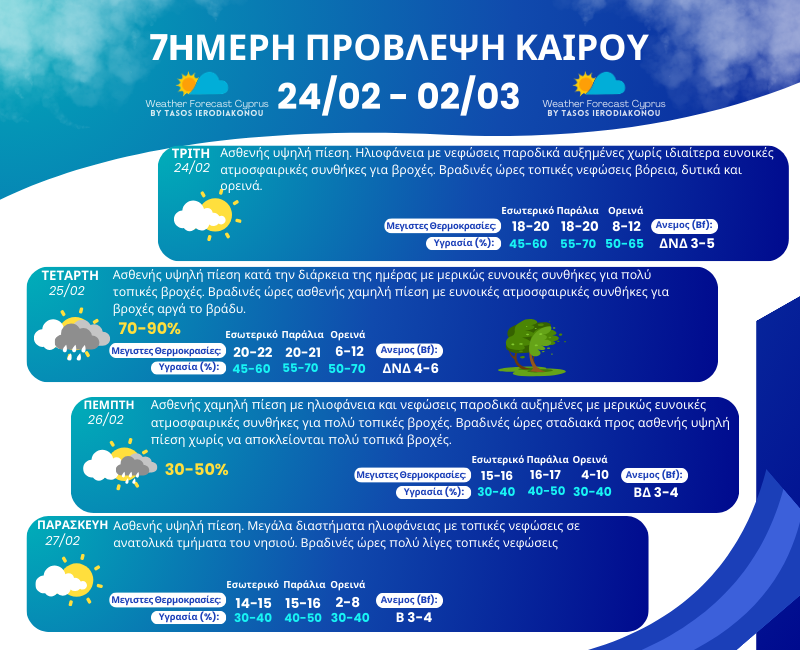 -Ένα γρήγορο πέρασμα χαμηλού βαρομετρικού φαίνεται την Τετάρτη προς Πέμπτη 25-26 Φεβρουαρίου με βροχές σε αρκετές περιοχές με τα δεδομένα που υπάρχουν μέχρι στιγμής. Πιο τοπικά από το μεσημέρι Τετάρτης και μετά με πιο ευνοικές τις ατμοσφαιρικές συνθήκες αργά το βράδυ. Μετά από αυτό το πέρασμα δεν φαίνεται κάτι να μας απασχολεί μέχρι και 2 Μαρτίου και πιθανόν για το πρώτο δεκαήμερο του Μάρτη. Πιθανολογώ τις βροχές του ο Μάρτης θα τις δώσεις μετά τις 15 Μαρτίου προς και 3 δεκαήμερο.
