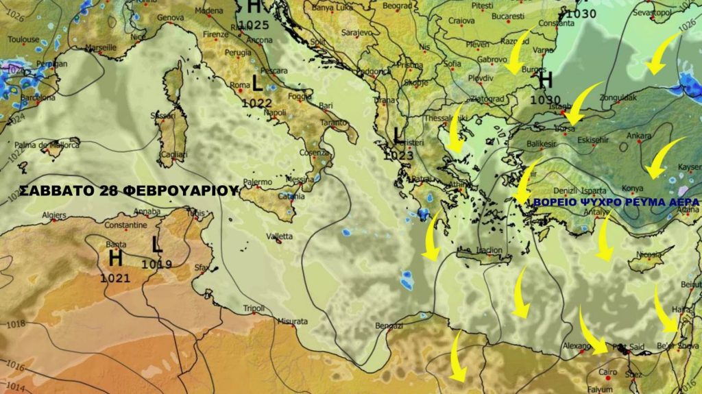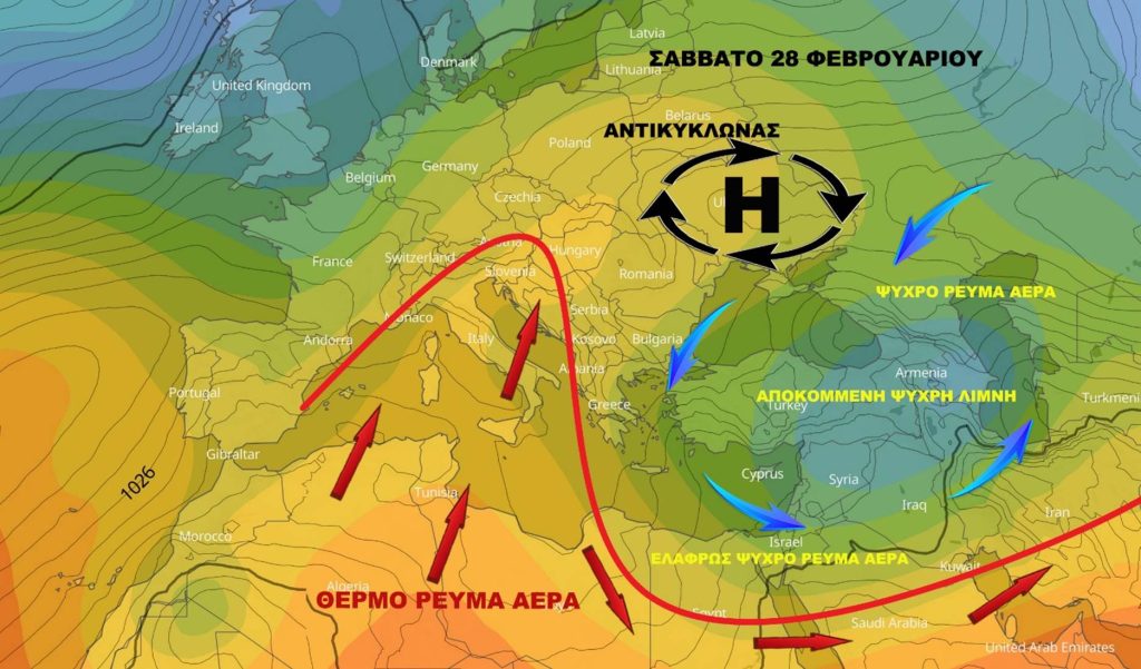Σάββατο 28 Φεβρουαρίου ανύψωση Αντικυκλώνα και θερμού ρεύματος αέρα σε κεντρική Ευρώπη διατηρεί ψυχρό ρεύμα αέρα στην δική μας περιοχή. Με την θέση του Αντικυκλώνα έχουμε αποκοπή ψυχρού ρεύματος αέρα με αποτέλεσμα να παρατηρείται αποκομμένη ψυχρή λίμνη στην ανώτερη ατμόσφαιρα. Δεν παρατηρείται κάποια ατμοσφαιρική διαταραχή για αυτό και δεν αναμένεται να έχουμε ιδιαίτερα φαινόμενα.
