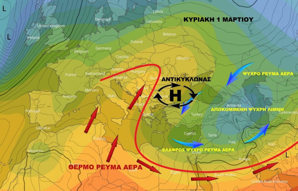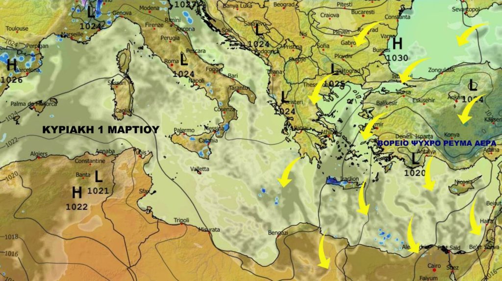 Κυριακή 1 Μαρτίου το ψυχρό ρεύμα αέρα παραμένει στην ανατολική Μεσόγειο με την αποκομμένη ψυχρή λίμνη στην ανώτερη ατμόσφαιρα με το καιρικό σκηνικό να παραμένει ψυχρό αλλά χωρίς ιδιαίτερα φαινόμενα. Καταρρέει ο Αντικυκλώνας νοτιότερα για να αρχίσει σταδιακά να υποχωρεί το ψυχρό ρεύμα προς τα πίσω και έτσι θα αρχίσει σταδιακά να ανεβαίνει η θερμοκρασία.