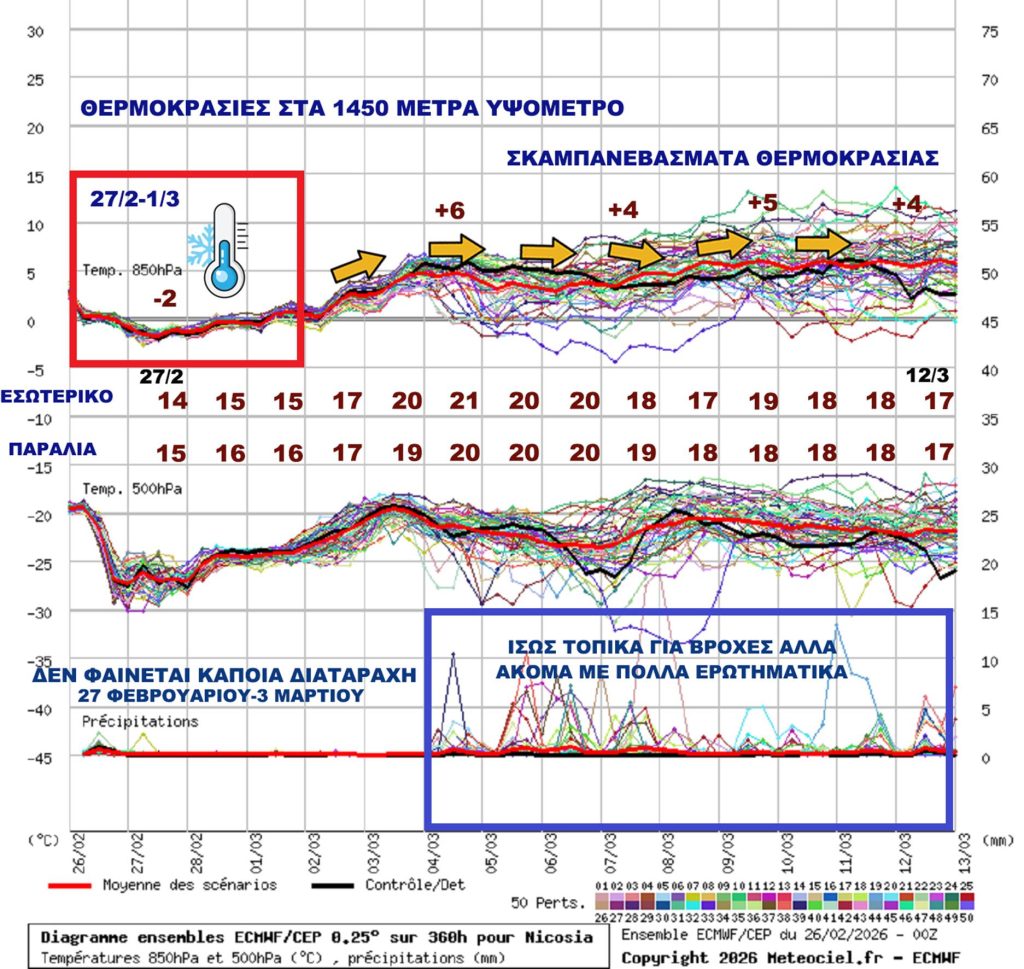 Με βάση το πιο πάνω σχεδιάγραμμα παρατηρούμε το ψυχρό ρεύμα αέρα που μας επηρεάζει αυτές τις ημέρες με χαμηλές θερμοκρασίες αλλά σταδιακά από επόμενη εβδομάδα υποχωρεί και η θερμοκρασία θα αρχίσει να σημειώνει άνοδο. Θα έχουμε αισθητή άνοδο αλλά δεν θα προσεγγίσει την περιοχή μας ιδιαίτερα θερμό ρεύμα αέρα με θερμοκρασίες λίγο πάνω της κανονικής. Ναι υποχωρεί το ψυχρό ρεύμα αέρα αλλά υπάρχει η τάση να επανέλθει προς το τέλος της άλλης εβδομάδας περίπου από 6 Μαρτίου και μετά με πτώση θερμοκρασίας αλλά δεν είναι ευδιάκριτο και ξεκάθαρο αν θα είναι έντονο το ψυχρό ρεύμα αέρα ή σε ελαφριά μορφή. Θα έχουμε εκ νέου ναι πτώση αλλά αν θα πέσει περισσότερο από αυτό που αναγράφω πιο πάνω θα ενημερωθείτε.