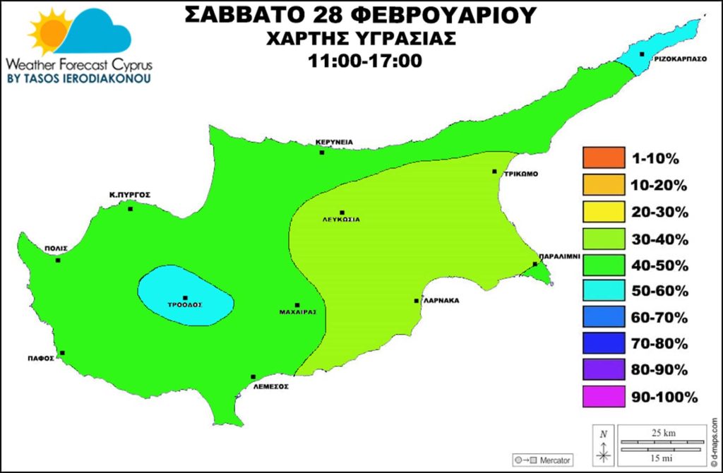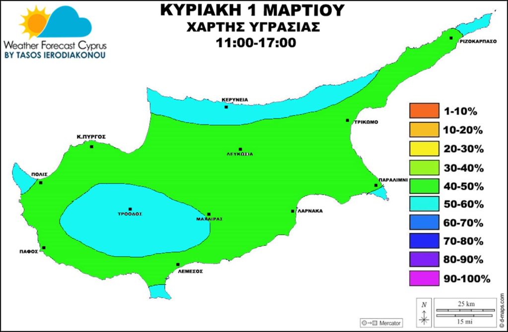Αυξάνονται λίγο τα ποσοστά αλλά παραμένουν μέτρια και θα είναι στο εσωτερικό μεταξύ 40-50%, στα ορεινά μεταξύ 40-60% και παράλια-παράκτια μεταξύ 40-60%. Βράδυ Κυριακής προς Δευτέρα ξημερώματα αυξάνονται μερικώς τα ποσοστά υγρασίας και θα είναι μεταξύ 60-80% αλλά τοπικά στα δυτικά, νότια και ορεινά έως 85-90%.