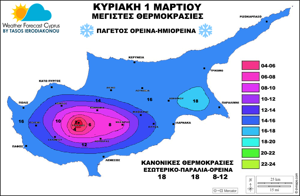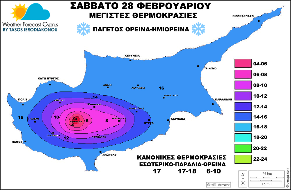 Μέγιστες θερμοκρασίες χωρίς ιδιαίτερη μεταβολή και θα είναι στο εσωτερικό μεταξύ 14-16 βαθμούς και πολύ πιο τοπικά προς ανατολικά μεταξύ 16-18 βαθμούς, παράκτιες-παράλιες περιοχές μεταξύ 14-16 βαθμούς και στα ορεινά μεταξύ 2-8 βαθμούς αναλόγως υψομέτρου και πάνω στον Όλυμπο από μηδέν έως μείον 2 βαθμούς. Θερμοκρασίες κάτω της κανονικής.