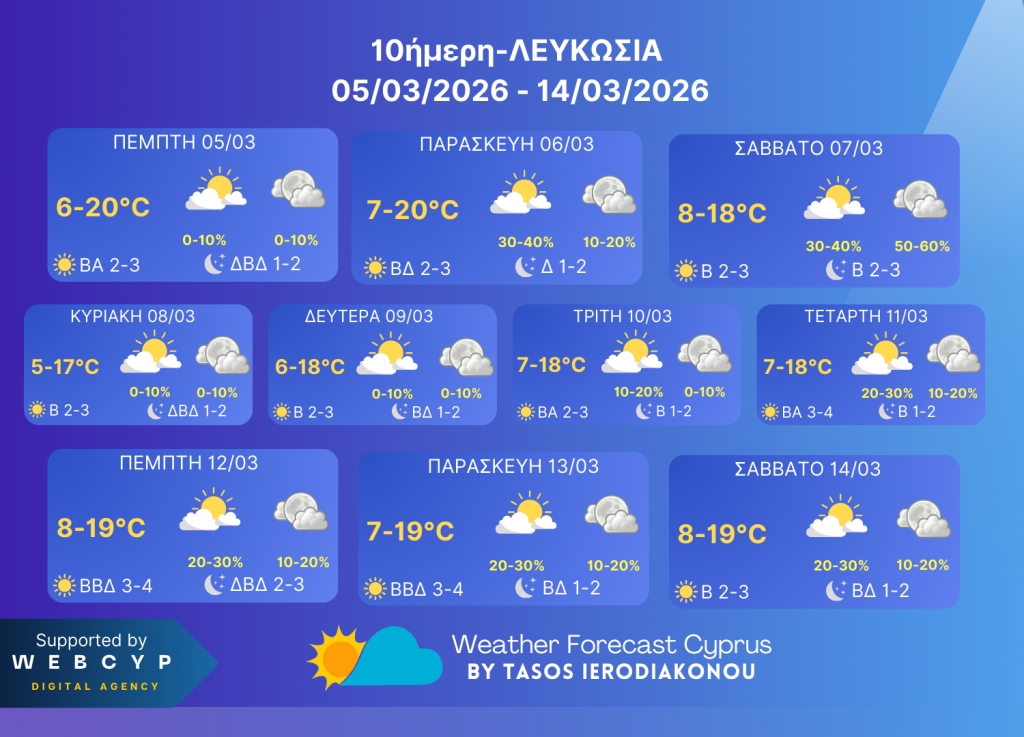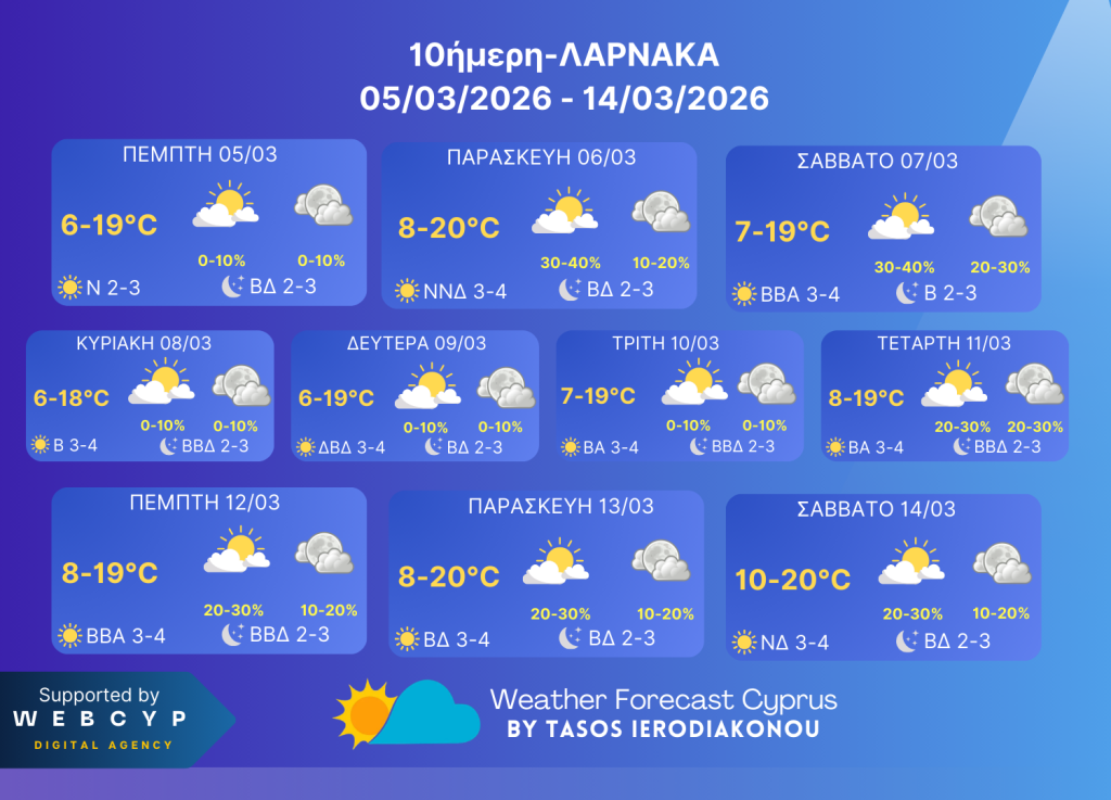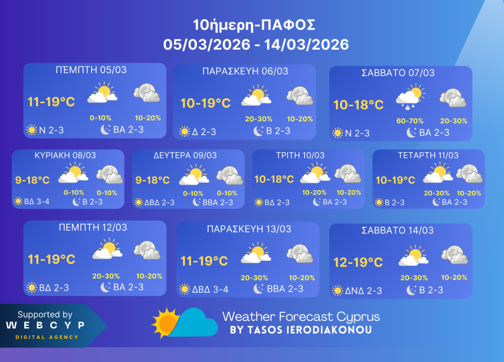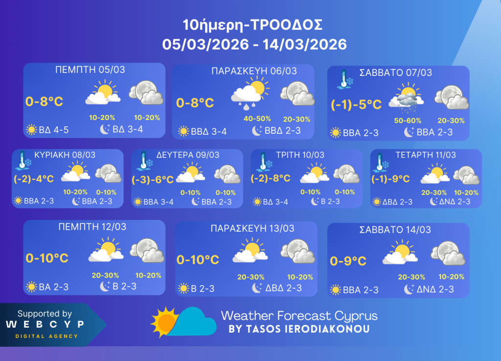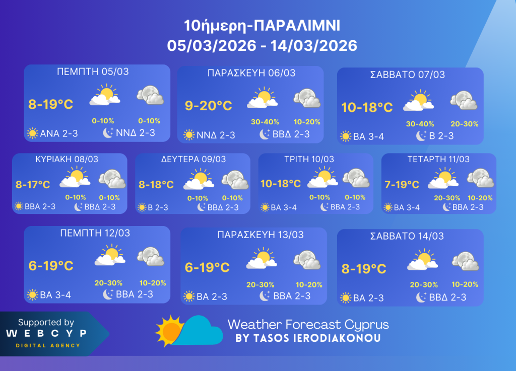 Μια δεκαήμερη πρόβλεψη που δεν φαίνεται κάποια σοβαρή και αξιόλογη ατμοσφαιρική διαταραχή να μας επηρεάζει. Βρισκόμαστε σε πεδίο υψηλών πιέσεων χωρίς πολλά περιθώρια για αξιόλογες βροχές. Όμως λόγω ψυχρού ρεύματος αέρα που εισέρχεται στην περιοχή μας θα ευνοηθεί μερική αστάθεια με τοπικού χαρακτήρα βροχές χωρίς να επηρεάζεται όμως όλο το νησί. Θερμοκρασιακά θα έχουμε κάποια πτώση από Αυλώνα ψυχρού ρεύματος αέρα που κατηφορίζει αλλά δεν θα μας επηρεάσει έντονα για να έχουμε ψύχος. Είναι πιο ήπιο αυτό το κατέβασμα του ψυχρού ρεύματος αέρα.