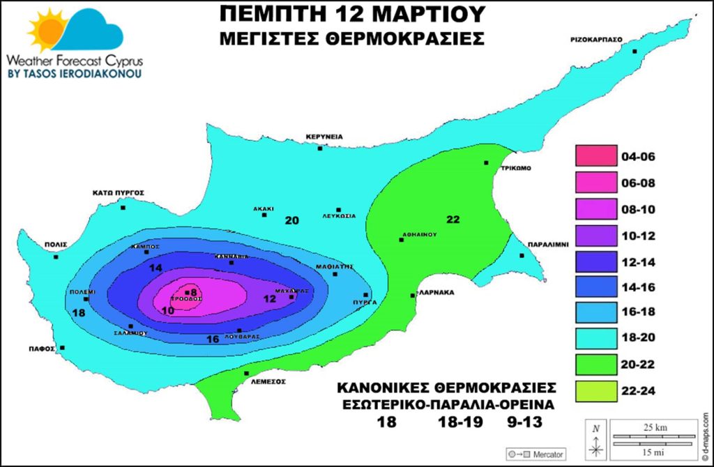Μέγιστες θερμοκρασίες σε μικρή άνοδο και θα είναι στο εσωτερικό μεταξύ 20-22 βαθμούς, παράκτιες-παράλιες περιοχές μεταξύ 19-22 βαθμούς και στα ορεινά μεταξύ 10-13 βαθμούς αναλόγως υψομέτρου και πάνω στον Όλυμπο στους 8 βαθμούς. Θερμοκρασίες πάνω της κανονικής.