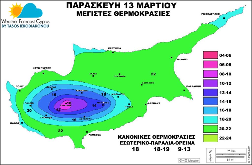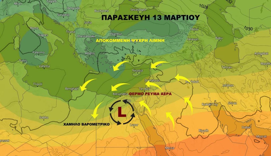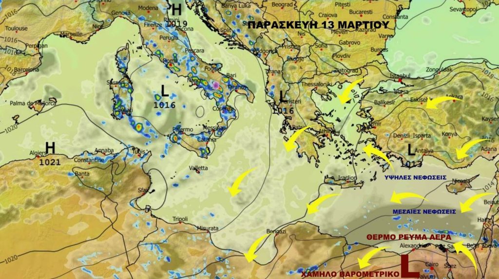 Παρασκευή 13 Μαρτίου ασθενής υψηλή πίεση αρχικά μέχρι το μεσημέρι ενώ ακολούθως απόγευμα προς βράδυ ασθενής χαμηλή πίεση λόγω του χαμηλού βαρομετρικού που μας προσεγγίζει από τα νότια. Ηλιοφάνεια και νεφώσεις παροδικά και τοπικά αυξημένες. Δεν φαίνονται ιδιαίτερα ευνοικές ατμοσφαιρικές για να έχουμε βροχές αλλά δεν αποκλείεται να κάνει κάτι πολύ τοπικού χαρακτήρα σε ορεινά τμήματα αλλά τίποτα το ιδιαίτερο. Βραδινές ώρες παροδικές νεφώσεις τοπικά αυξημένες με κάποιες λασποβροχές να φαίνονται νότια της Κύπρου στο θαλάσσιο χώρο.