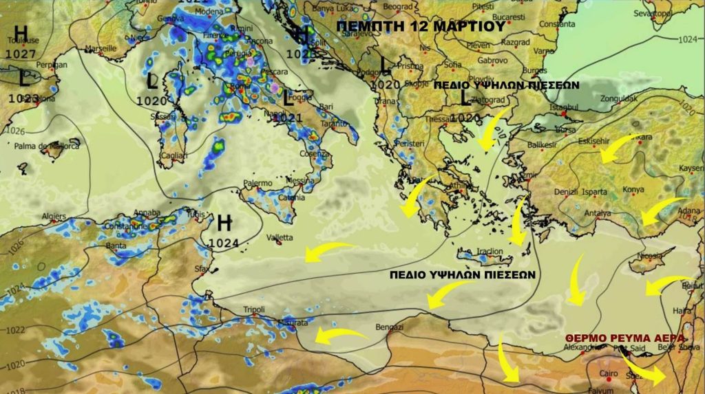 Πέμπτη 12 Μαρτίου ασθενής υψηλή πίεση με ηλιοφάνεια και νεφώσεις παροδικά και τοπικά αυξημένες με ένα μικρό ενδεχόμενο πολύ τοπικά για βροχή μεσημέρι προς απόγευμα στα ορεινά αλλά δεν φαίνονται ακόμα ιδιαίτερα ευνοικές ατμοσφαιρικές για να έχουμε βροχές. Βραδινές ώρες παροδικές νεφώσεις τοπικά αυξημένες.