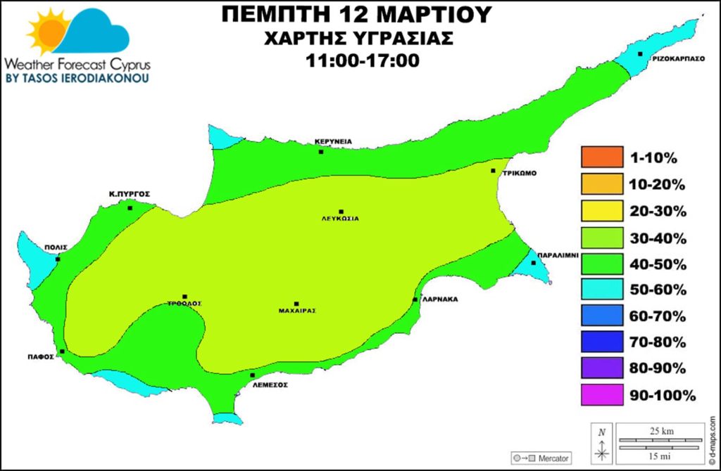 Χαμηλά έως μέτρια τα ποσοστά υγρασίας. Σε εσωτερικό μεταξύ 30-40%, στα ορεινά μεταξύ 35-45% και παράλια-παράκτια μεταξύ 40-55%. Βράδυ Πέμπτης προς Παρασκευή ξημερώματα αυξάνονται λίγο τα ποσοστά υγρασίας σε σχέση με την ημέρα και θα είναι μεταξύ 60-80% αλλά τοπικά στο εσωτερικό, ορεινά και στα δυτικά παράκτια μεταξύ 80-90%.