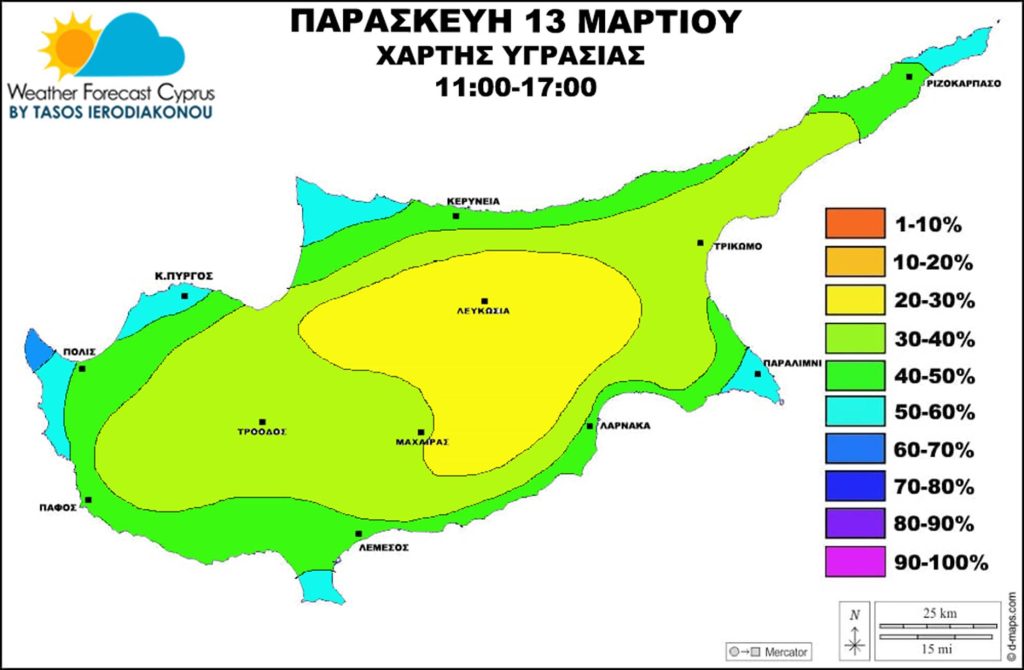 Μειώνονται λίγο τα ποσοστά υγρασίας και παραμένουν χαμηλά έως μέτρια. Σε εσωτερικό μεταξύ 25-40%, στα ορεινά μεταξύ 30-50% και παράλια-παράκτια μεταξύ 40-60%. Βράδυ Παρασκευής προς Σάββατο ξημερώματα αυξάνονται λίγο τα ποσοστά υγρασίας σε σχέση με την ημέρα και θα είναι μεταξύ 60-75% αλλά πολύ τοπικά στα ορεινά και στα δυτικά παράκτια μεταξύ 75-85%.