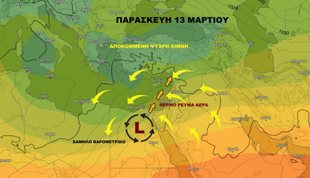 Σάββατο 14 Μαρτίου χαμηλή πίεση θα επηρεάζει την περιοχή μας λόγω χαμηλού βαρομετρικού νότια-νοτιοανατολικά της Κύπρου στο θαλάσσιο χώρο με βροχές στην ευρύτερη περιοχή που θα επηρεάσουν και το νησί μας σε συνδυασμό με σκόνη στην ατμόσφαιρα. Τοπικές βροχές ελαφριάς έως μέτριας έντασης ενώ πολύ πιο τοπικά μπορεί να παρατηρηθεί έντονη βροχόπτωση στα νότια προς ανατολικά τμήματα από το θερμό μέτωπο του χαμηλού ανατολικά-νοτιοανατολικά της Κύπρου. Περίπου από το μεσημέρι Σαββάτου προς βραδινές ώρες μεταξύ των ωρών 11:00-18:00 και ακολούθως να αρχίσουν να περιορίζονται σημαντικά οι βροχές και να σταματούν άρα δεν θα έχει μεγάλη διάρκεια η αλλαγή με τις βροχές. Πιθανές περιοχές με πιο αυξημένο ρίσκο είναι από επαρχία Λεμεσού, προς επαρχία Λάρνακας-Αμμοχώστου, κεντρικά προς ανατολικά τμήματα ορεινών περιοχών και από Λευκωσία προς κατεχόμενα χωρίς να σημαίνει ότι θα είναι παντού οι βροχές και στις περιοχές που έχω αναφέρει.