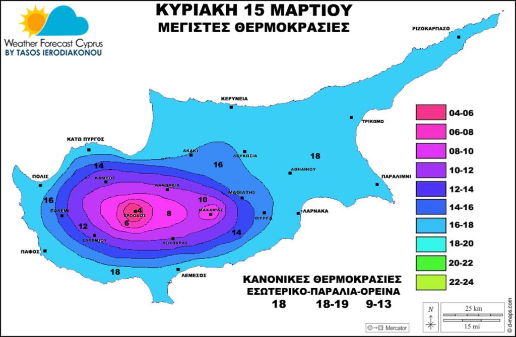 Μέγιστες θερμοκρασίες θα είναι στο εσωτερικό έως 18 βαθμούς, παράκτιες-παράλιες περιοχές έως 18 βαθμούς και στα ορεινά μεταξύ 6-10 βαθμούς αναλόγως υψομέτρου και πάνω στον Όλυμπο έως 4 βαθμούς. Θερμοκρασίες κοντά στις κανονικές έως λίγο κάτω.
