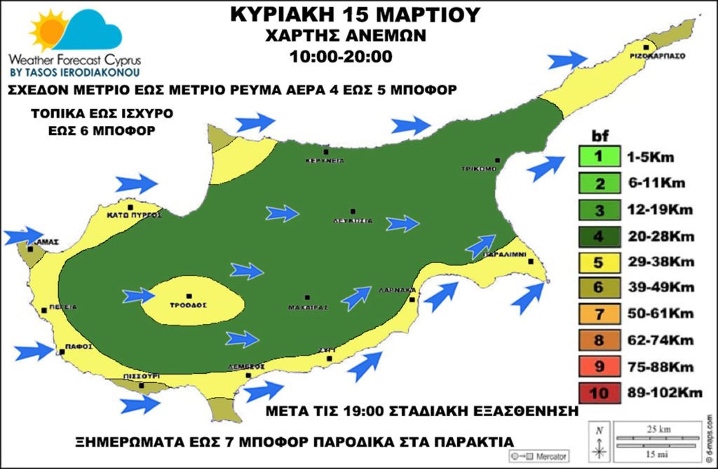 Αλλαγή ρεύματος αέρα σε Δυτικό έως Νοτιοδυτικό. Ξημερώματα με πρώτες πρωινές ώρες παροδικά στα παράκτια θα φτάνει και τα 7 μποφόρ. Μετά τις 10:00-11:00 σχεδόν μέτριο έως μέτριο το πεδίο ανέμων 4 έως 5 μποφόρ μεταξύ των ωρών 10:00-20:00 αλλά παροδικά και όχι συνεχόμενα έως ισχυρό ρεύμα αέρα στα 6 μποφόρ. Βραδινές ώρες Δυτικό ρεύμα αέρα 2 έως 4 μποφόρ μέσα στο νησί αλλά παράκτια-παράλια παροδικά και έως 5 μποφόρ.