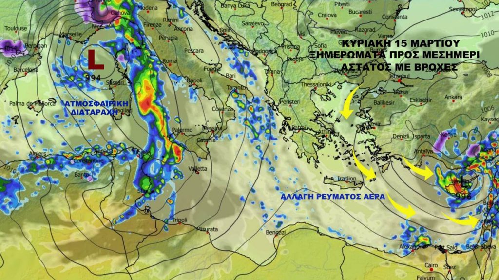 Κυριακή 15 Μαρτίου χαμηλό βαρομετρικό συνεχίζει να επηρεάζει την περιοχή μας με αποτέλεσμα να επικρατεί άστατος καιρός με βροχές. Ξημερώματα και πρωινές ώρες περίπου στις 04:00-05:00 αναμένεται το τελικό πέρασμα βροχών του συγκεκριμένου χαμηλού από τα δυτικά προς ανατολικά. Βροχές μέτριας έως και έντονης έντασης ενώ πιο τοπικά θα έχουμε και περιορισμένες καταιγίδες. Μέσα από καταιγίδα λίγη ηλεκτρική δραστηριότητα με μικρού μεγέθους χαλαζόπτωση και αρκετή ποσότητα βροχής.