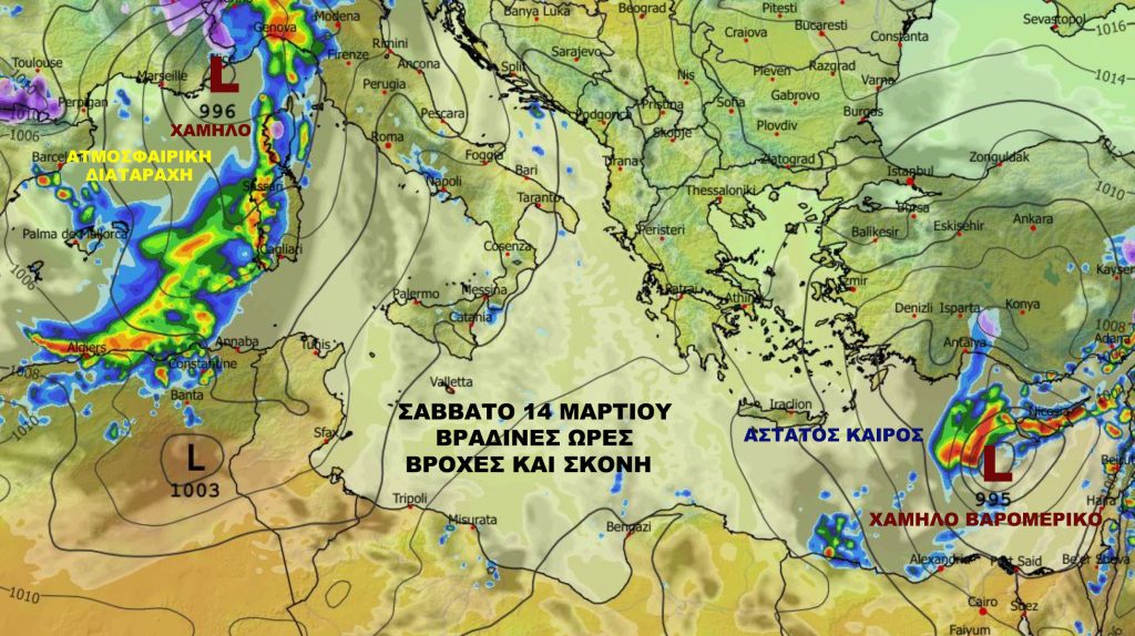 Bραδινές ώρες Σαββάτου το χαμηλό βαρομετρικό θα βρίσκεται νοτιοδυτικά της Κύπρου και θα επικρατεί περίπου από τις 20:00 προς τα μεσάνυχτα άστατος καιρός με βροχές σε αρκετές περιοχές και τοπικές καταιγίδες. Μέσα από καταιγίδα θα παρατηρείται μερική ηλεκτρική δραστηριότητα και μικρού μεγέθους χαλαζόπτωση.