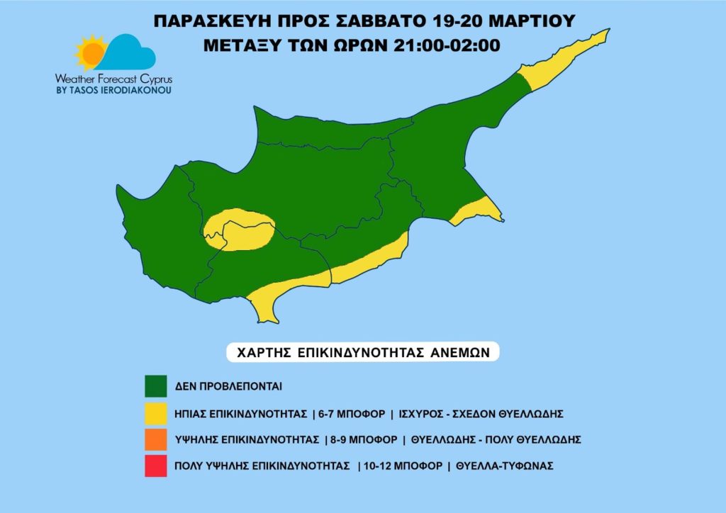 Προσοχή στο πεδίο ανέμων ειδικά βραδινές ώρες Παρασκευής και μετά τα μεσάνυχτα προς Σάββατο λόγω ισχυρού πεδίου στα 6 μποφόρ και πιθανόν παροδικά έως 7 μποφόρ στα νότια-νοτιοανατολικά, ανατολικά και βορειοανατολικά παράκτια τμήματα και ψηλά ορεινά. Πιθανές ριπές ανέμων έως 8 μποφόρ. Με βάση τον χάρτη υπάρχει μια ήπια επικινδυνότητα.