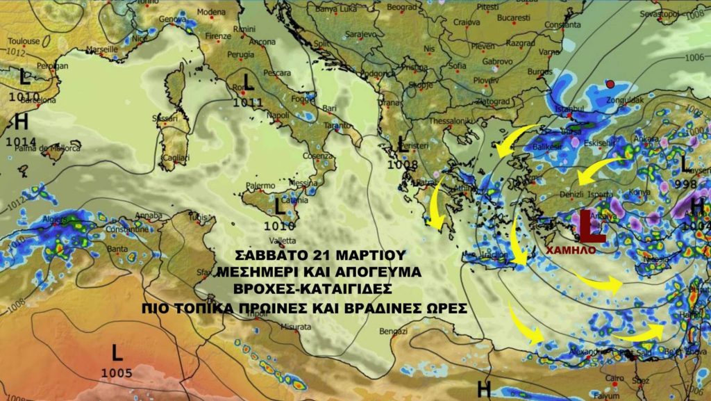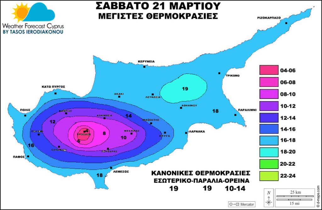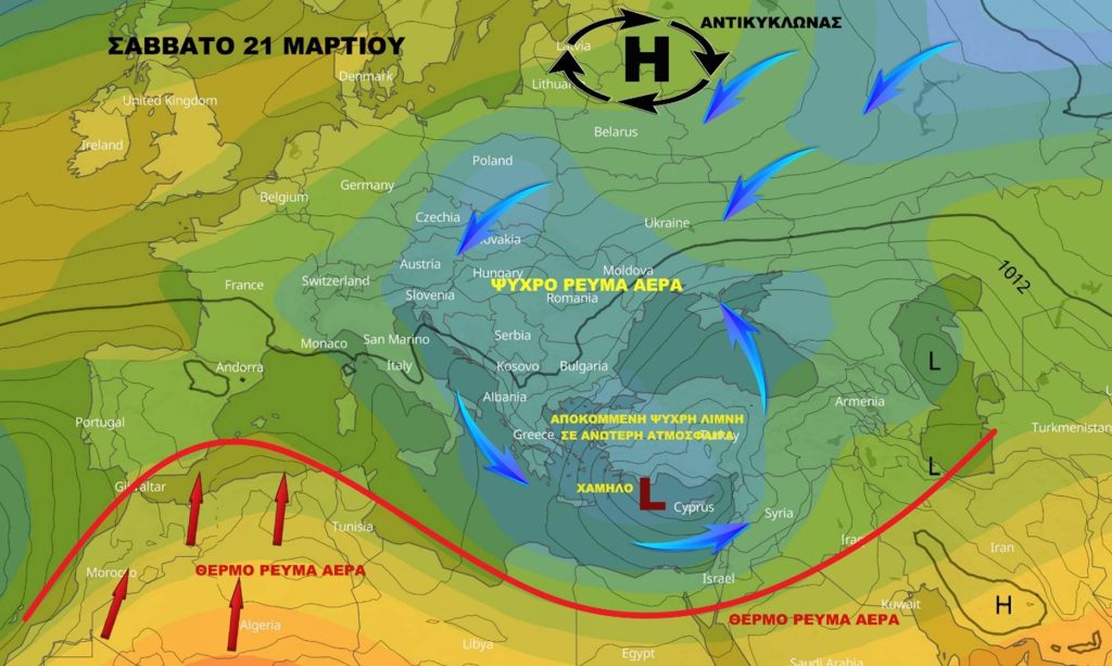 Σάββατο 21 Μαρτίου χαμηλό βαρομετρικό στην επιφάνεια και αποκομμένη ψυχρή λίμνη στην ανώτερη ατμόσφαιρα επηρεάζουν την περιοχή μας με αποτέλεσμα να έχουμε άστατο καιρό με βροχές και καταιγίδες αλλά και χιόνια πάνω στο Τρόοδος. Με την θέση του Αντικυκλώνα βορειότερα από εμάς ευνοείται μια συνεχή ροή ψυχρού ρεύματος αέρα σε κεντρική και ανατολική Ευρώπη με το θερμό ρεύμα αέρα να μην μπορεί να προσεγγίσει την περιοχή μας.