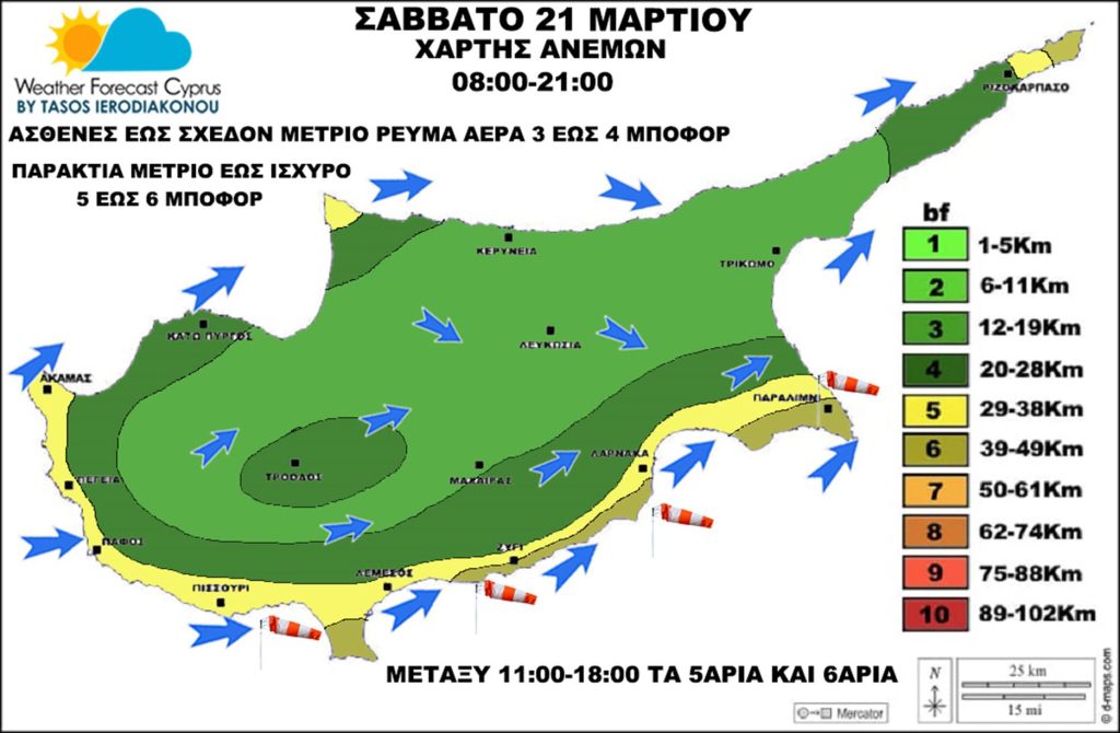 Σε εξασθένηση το πεδίο ανέμων για να είναι ασθενές έως σχεδόν μέτριο ρεύμα αέρα 3 έως 4 μποφόρ κυρίως μεταξύ των ωρών 09:00-18:00 αλλά πιο τοπικά στα νότια-νοτιοανατολικά παράκτια-παράλια τμήματα έως μέτριο ρεύμα αέρα στα 5 μποφόρ. Μετά τις 18:00 σταδιακή εξασθένηση για να επικρατεί τις βραδινές ώρες ένα πεδίο ανέμων πολύ ασθενές έως ασθενές 2 έως 3 μποφόρ.