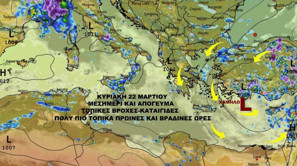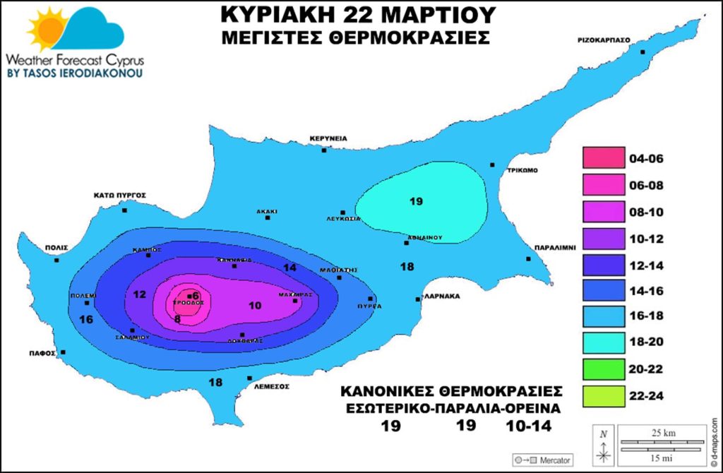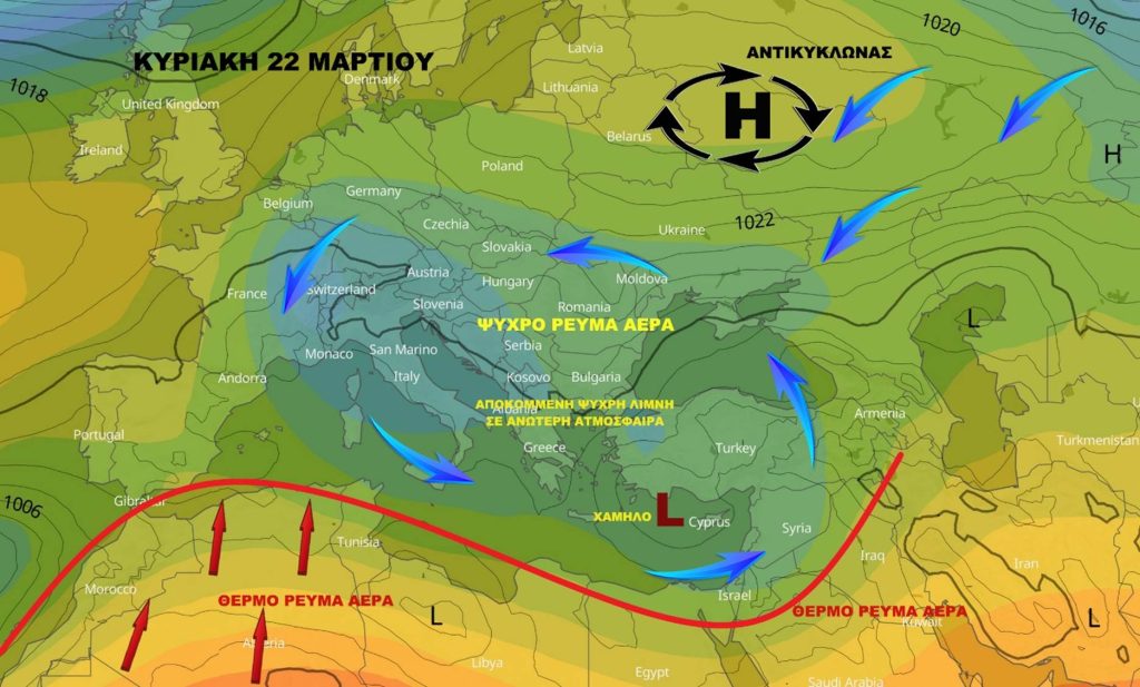 Κυριακή 22 Μαρτίου το χαμηλό βαρομετρικό θα συνεχίσει να βρίσκεται στην περιοχή μας δυτικά-βορειοδυτικά στο θαλάσσιο χώρο με αποτέλεσμα κατά περιόδους θα έχουμε τοπικές βροχές και τοπικές καταιγίδες με ηλεκτρική δραστηριότητα μεσημέρι και απόγευμα. Πάνω στο Τρόοδος θα παρατηρείται χιονόπτωση. Ο Αντικυκλώνας παραμένει βορειότερα της Κύπρου κοντά σε Ουκρανία-Ρωσία με αποτέλεσμα να παραμένει εγκλωβισμένη η αποκομμένη ψυχρή λίμνη στην ανώτερη ατμόσφαιρα από κεντρική προς νότια Ευρώπη και Μεσόγειο διατηρώντας ασταθείς καιρικές συνθήκες.