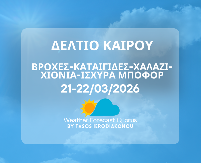 Σάββατο 21 Μαρτίου χαμηλό βαρομετρικό στην επιφάνεια και αποκομμένη ψυχρή λίμνη στην ανώτερη ατμόσφαιρα επηρεάζουν την περιοχή μας με αποτέλεσμα να έχουμε άστατο καιρό με βροχές και καταιγίδες αλλά και χιόνια πάνω στο Τρόοδος. Με την θέση του Αντικυκλώνα βορειότερα από εμάς ευνοείται μια συνεχή ροή ψυχρού ρεύματος αέρα σε κεντρική και ανατολική Ευρώπη με το θερμό ρεύμα αέρα να μην μπορεί να προσεγγίσει την περιοχή μας.
