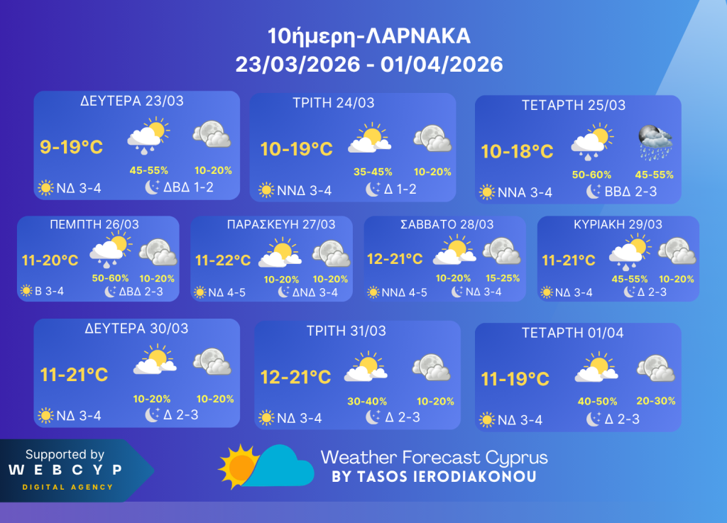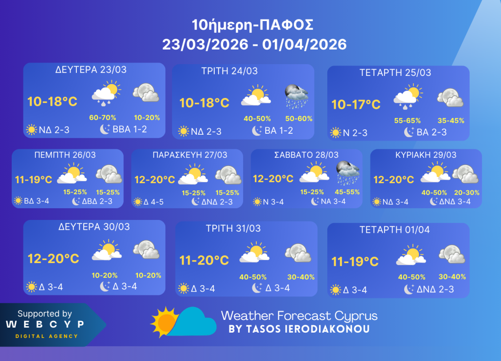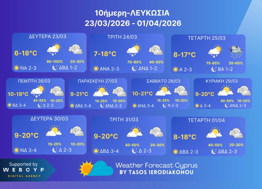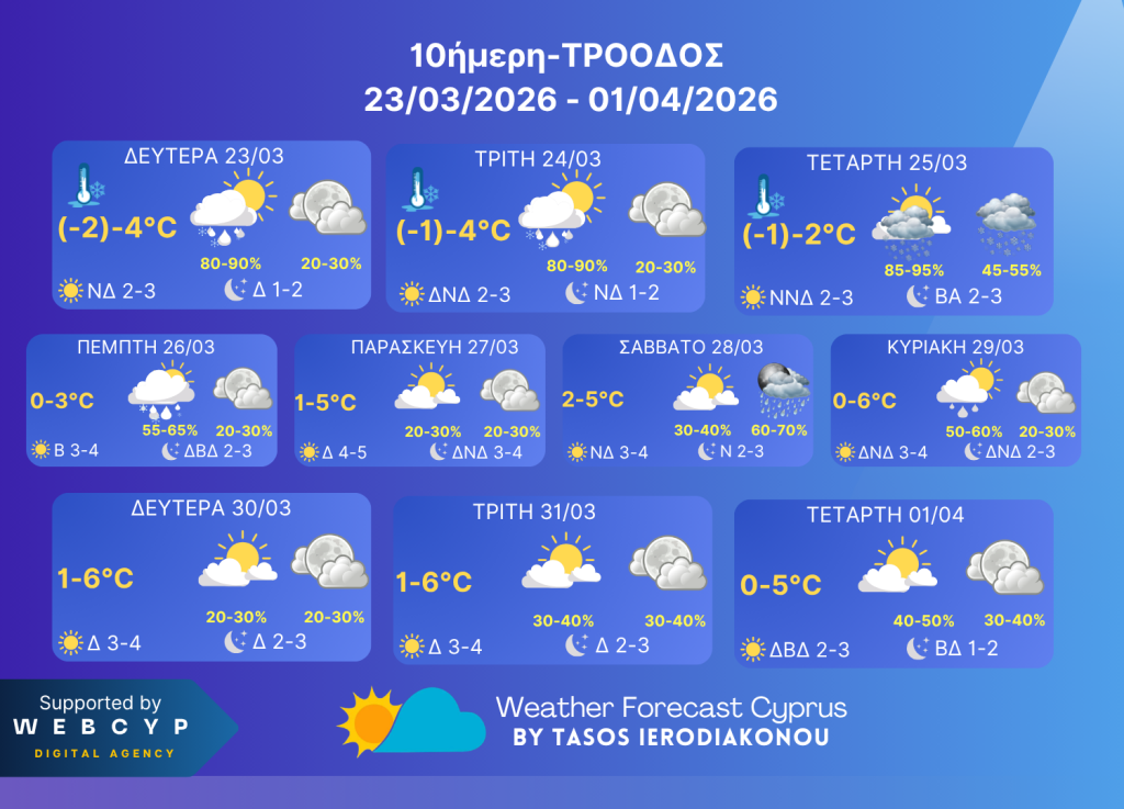 Παραμένει καιρικά ασταθής η ατμόσφαιρα της περιοχής μας το επόμενο δεκαήμερο μέχρι τέλος Μαρτίου και αρχές Απριλίου αλλά κατά περιόδους και τόπους τόπους και δεν θα είναι συνέχεια διότι θα έχουμε και μεγάλα ανοίγματα. Προς το τέλος Μαρτίου με αρχές Απριλίου όπως θα δείτε αυξάνεται το ρίσκο βροχής αλλά επειδή ακόμα δεν είναι ξεκάθαρο δεν βάζω το εικονίδιο βροχής. Πάνω στο Τρόοδος μέχρι και την Τετάρτη φαίνεται να ευνοείται παροδικά χιονόπτωση ενώ μετά βροχή-χιονόνερο.