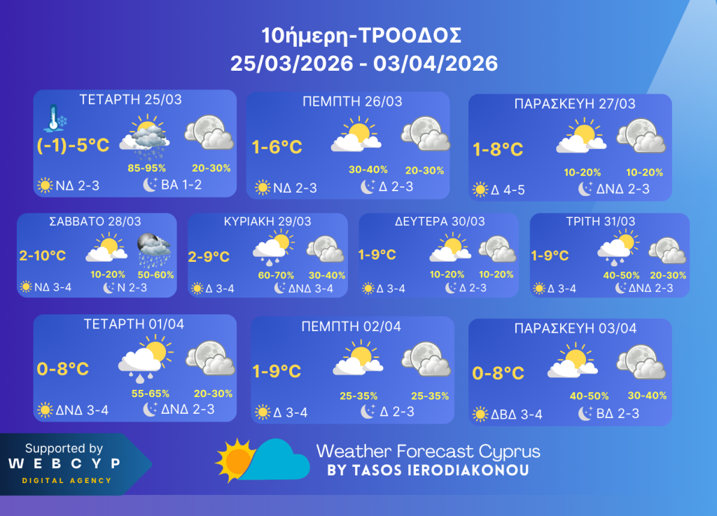 Παραμένει καιρικά ασταθής η ατμόσφαιρα της περιοχής μας το επόμενο δεκαήμερο μέχρι και αρχές Απριλίου αλλά κατά περιόδους, μέρες μέρες και τόπους τόπους και δεν θα είναι συνέχεια τα φαινόμενα διότι θα έχουμε και μεγάλα ανοίγματα. Πάνω στο Τρόοδος μέχρι και την Τετάρτη φαίνεται να ευνοείται παροδικά χιονόπτωση ενώ μετά βροχή-χιονόνερο. Το ρίσκο βροχής θα παρουσιάζει διακυμάνσεις για αυτό και θα ενημερώνεστε ανά τακτά διαστήματα για πιθανές αλλαγές.