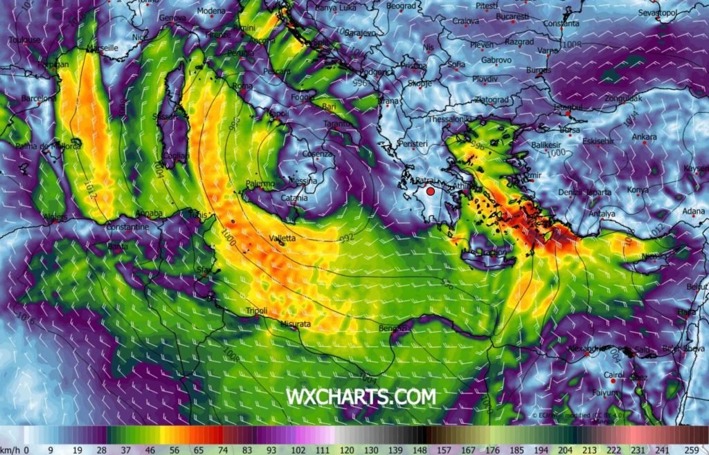 Φαίνεται και ένα άλλο βαθύ χαμηλό βαρομετρικό να βγαίνει από τα βάθη της Αφρικής διασχίζει την Λιβύη και βγαίνει προς την Μεσόγειο νότια της Ελλάδας ακολουθώντας βόρεια πορεία στον Ελλαδικό χώρο.