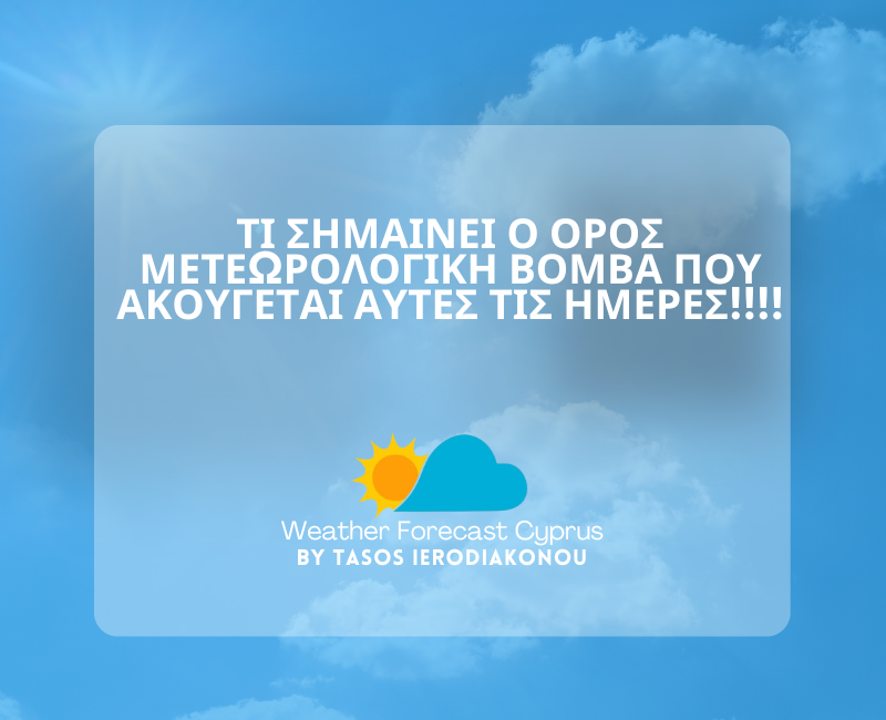 Φίλες και Φίλοι αυτές τις ημέρες υπάρχει μια συζήτηση στην Ελλάδα στον κόσμο της Μετεωρολογίας για πιθανή Μετεωρολογική βόμβα με αποτέλεσμα να δέχομαι ερωτήματα τι μπορεί να είναι και τι φαινόμενα μπορεί να φέρει και αν θα επηρεάσει την Κύπρο.