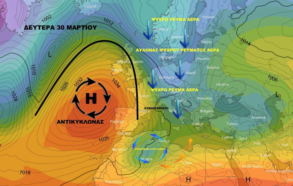 Χάρτης 1 που είναι Δευτέρα 30 Μαρτίου ο Αζορικός Αντικυκλώνας ανυψώνεται σε πιο βόρεια γεωγραφικά πλάτη με αποτέλεσμα το κατέβασμα Αυλώνα ψυχρού ρεύματος αέρα νοτιότερα που εκτείνεται μέχρι και δυτική Μεσόγειο. Πάνω στο χάρτη στη Μεσόγειο κάτω από Γαλλία θα έχουμε κυκλογέννεση δηλαδή δημιουργία χαμηλού βαρομετρικού που κινούμενο νότια προς Σικελία θα αρχίσει να βαθαίνει και αναλόγως πόσο γρήγορα και πόσο θα βαθύνει ακριβώς θα εξαρτηθεί αν μπορεί να χαρακτηριστεί Μετεωρολογική βόμβα ή όχι. Δείχνει να ξεκινά περίπου στα 1010hpa και να πέφτει μέχρι και τα 986hpa που ίσως να πληρεί οριακά τα στοιχεία για Μετεωρολογική βόμβα αλλά ακόμα δεν είναι απόλυτα ότι θα έχει αυτή την βάθυνση. Θα βαθύνει αρκετά ναι αλλά ακόμα πρέπει να περιμένουμε. Όμως θα είναι ένα βαθύ χαμηλό βαρομετρικό με έντονα καιρικά φαινόμενα που χρήζει μεγάλης προσοχής.