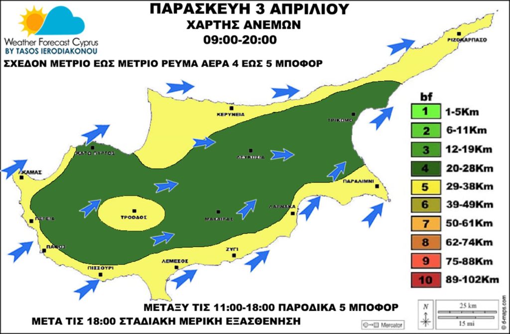 Δυτικό-Νοτιοδυτικό ρεύμα αέρα σχεδόν μέτριο έως μέτριο ρεύμα αέρα 4 έως 5 μποφόρ. Μεταξύ των ωρών 11:00-18:00 παροδικά έως 5 μποφόρ ενώ μετά τις 18:00 αναμένεται σταδιακή μερική εξασθένηση. Βραδινές ώρες Δυτικό-Νοτιοδυτικό το πεδίο ανέμων ασθενές 2 έως 3 μποφόρ μέσα στο νησί αλλά στα παράκτια-παράλια τμήματα έως σχεδόν μέτριο στα 4 μποφόρ παροδικά.