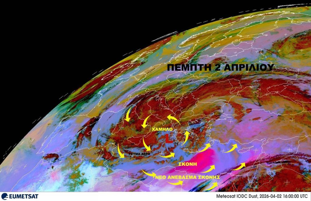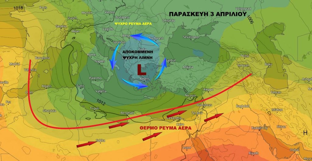 Αποκομμένη ψυχρή λίμνη σε ανώτερη ατμόσφαιρα και χαμηλό βαρομετρικό στην επιφάνεια περιοχή Ελλάδας θα ευνοεί σε άστατο καιρό σε περιοχές της Ελλάδας ενώ πιο τοπικά θα επηρεαστεί και η Κύπρος. Με την θέση που έχει η ατμοσφαιρική διαταραχή σκάβει σκόνη από Αφρική-Λιβύη με αποτέλεσμα η δική μας περιοχή να δέχεται σκόνη κατά περιόδους αυξημένη. Υποχωρεί μερικώς το θερμό ρεύμα ανοτιότερα με την θερμοκρασία σε μικρή πτώση.