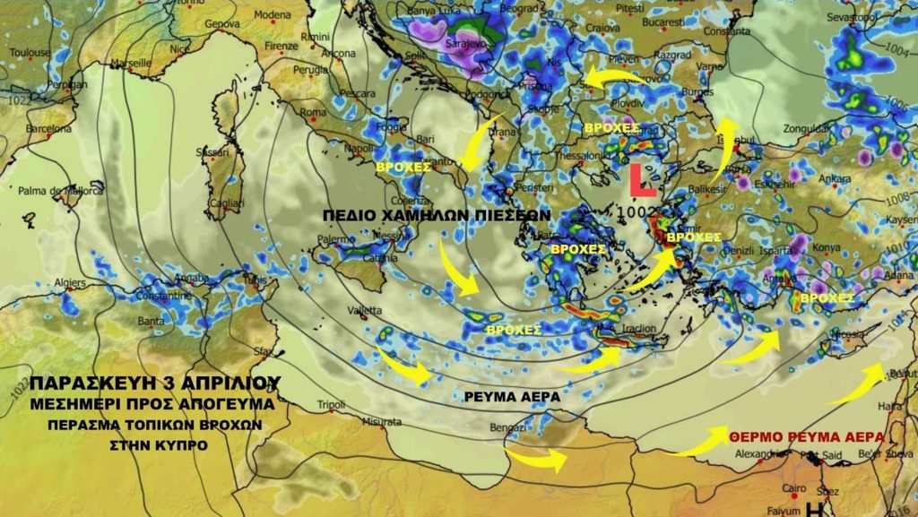 Πέραν από την σκόνη αναμένονται και κάποιες βροχές ελαφριάς έως μέτριας έντασης Παρασκευή και Σάββατο αλλά δεν αναμένεται να βρέξει παντού και θα είναι μεσημέρι και απόγευμα. Την Κυριακή 5 Απριλίου και Μεγάλη Δευτέρα αποκομμένη ψυχρή λίμνη στην ανώτερη ατμόσφαιρα βορειοδυτικά της Κύπρου θα ευνοεί σε ασταθή καιρικό σκηνικό μεσημέρι και απόγευμα σε ορεινά-ημιορεινά προς περιοχές εσωτερικού και ανατολικά-βορειοανατολικά με πιθανότητα να έχουμε πιο τοπικά και καταιγίδες.