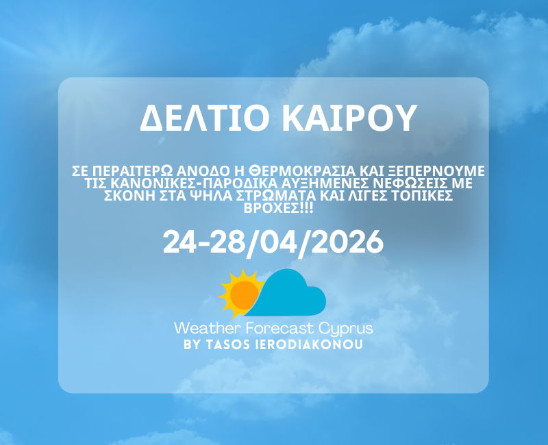 Σε περαιτέρω άνοδο η θερμοκρασία και ξεπερνούμε τις κανονικές-Παροδικά αυξημένες νεφώσεις με σκόνη στα ψηλά στρώματα και λίγες τοπικές βροχές!!!